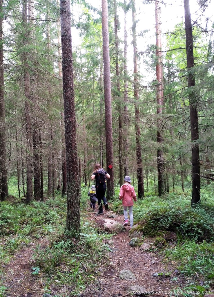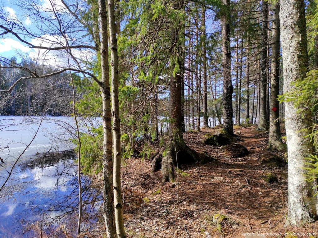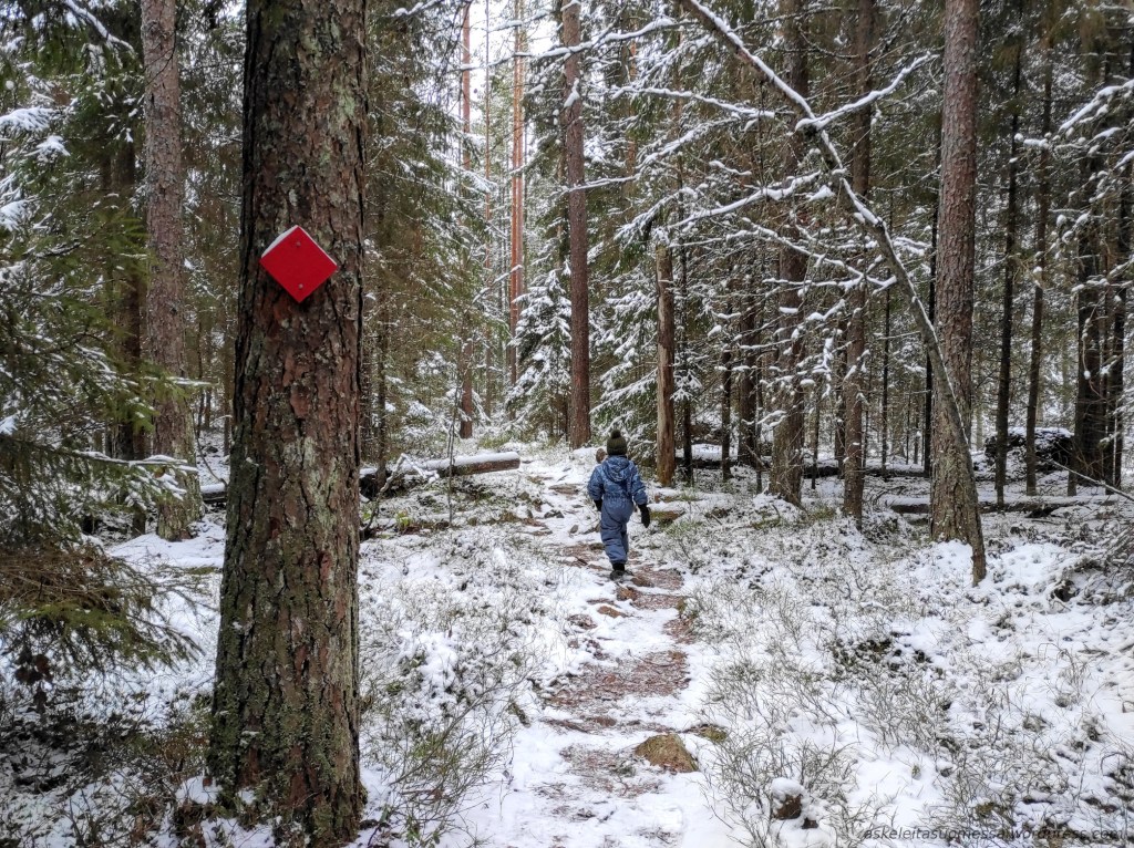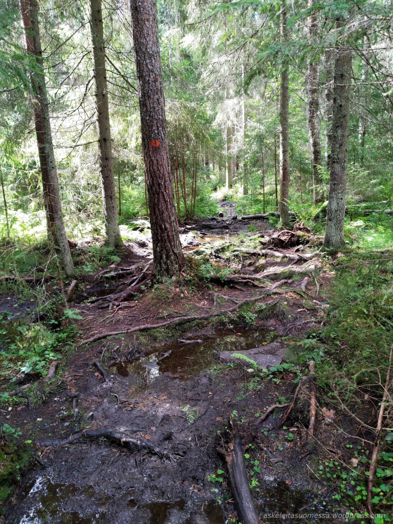 Vaikeus: Tavallinen metsäpolku eli kiviä ja puiden juuria on reitillä. Osittain matkalla on isoja märkiä lammikko-/mutakohtia, joita joutuu hieman väistelemään. Parissa kohtaa on lyhyet pitkospuut.