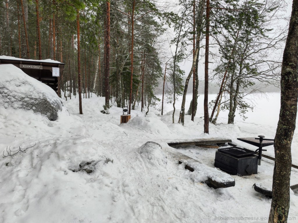 Kivikeskun rannalta löytyy kaksi nuotiopaikkaa. Polttopuita löytyy reitin alusta eli nuotiota kaipaavan kannattaa varautua jollakin kassilla, jolla saa puita kuljetettua nuotiopaikalle.