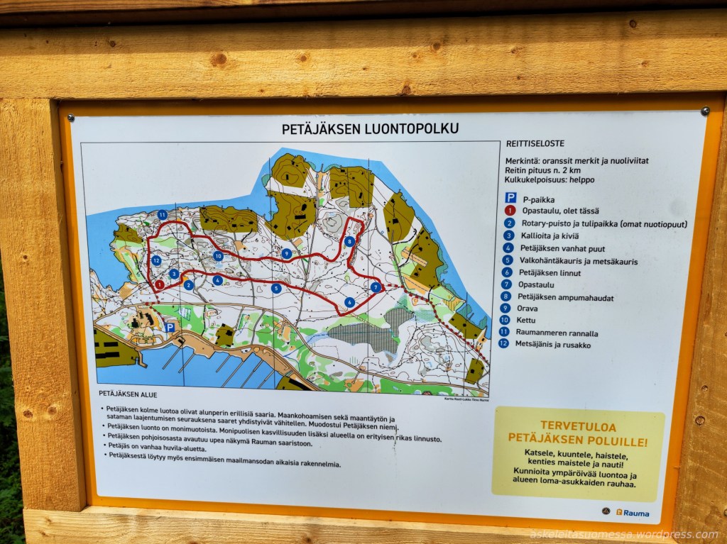 Sijainti: Rauman Petäjäksen alueella. Me pysäköimme luontopolun aloituskohtaan eli Petäjäksentieltä kääntyvälle pikkutielle, mihin sopii muutama auto parkkiin, mutta vasta sitten huomasimme, että virallinen parkkipaikka löytyisi Leppäläntieltä (ks. kartta alempana).