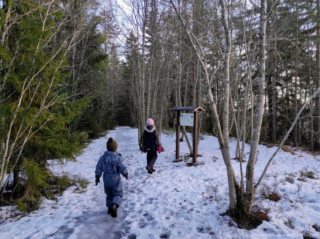 Näköalapaikan jälkeen polku laskeutuu alas harjulta ja jonkin matkaa reitti on sen jälkeen leveää liikuntapolkua, missä myöhemmin talvella pitäisi olla myös kunnollinen hiihtolatu.