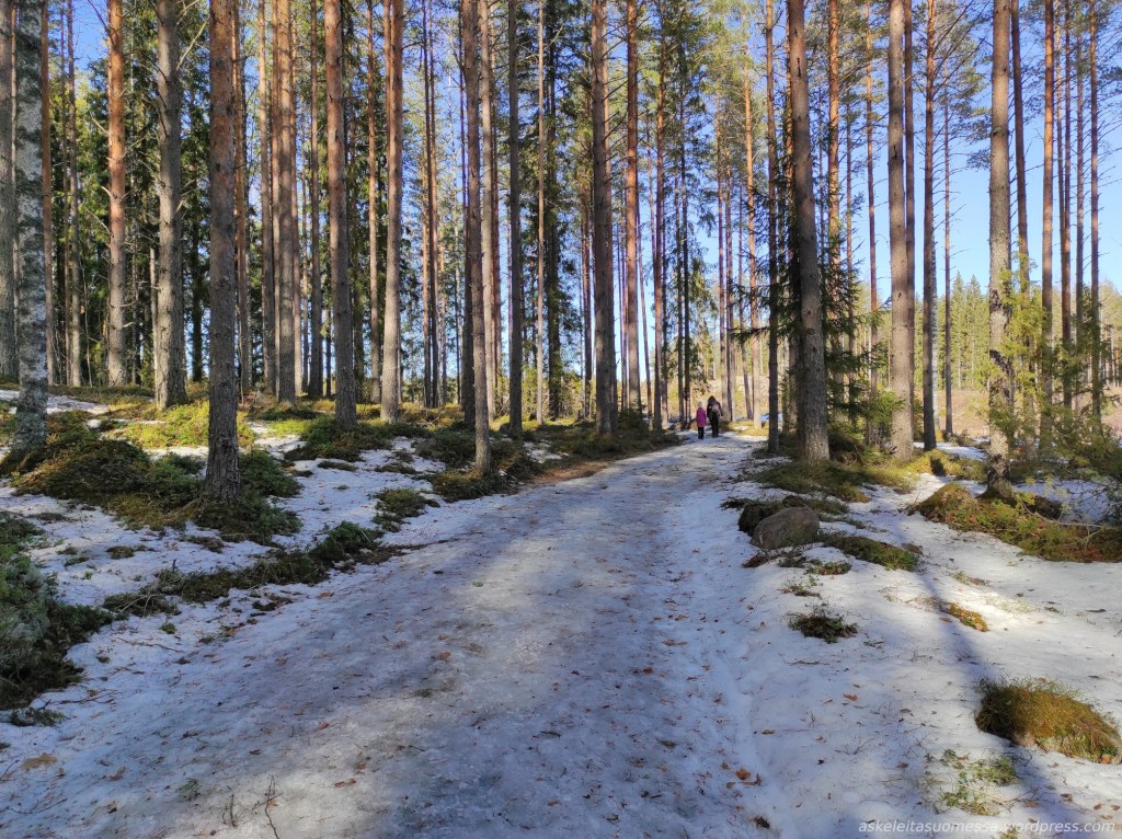 Suo-osuuden jälkeen reitti kulkee pienen matkan autotietä pitkin, kunnes jälleen käännytään metsään.