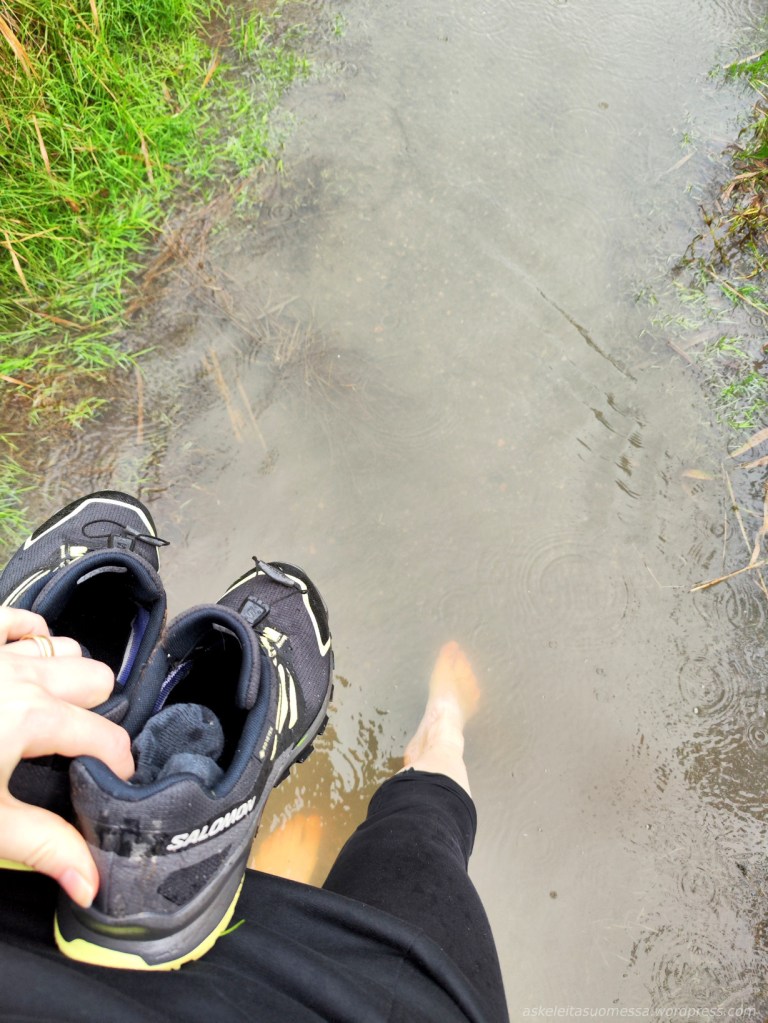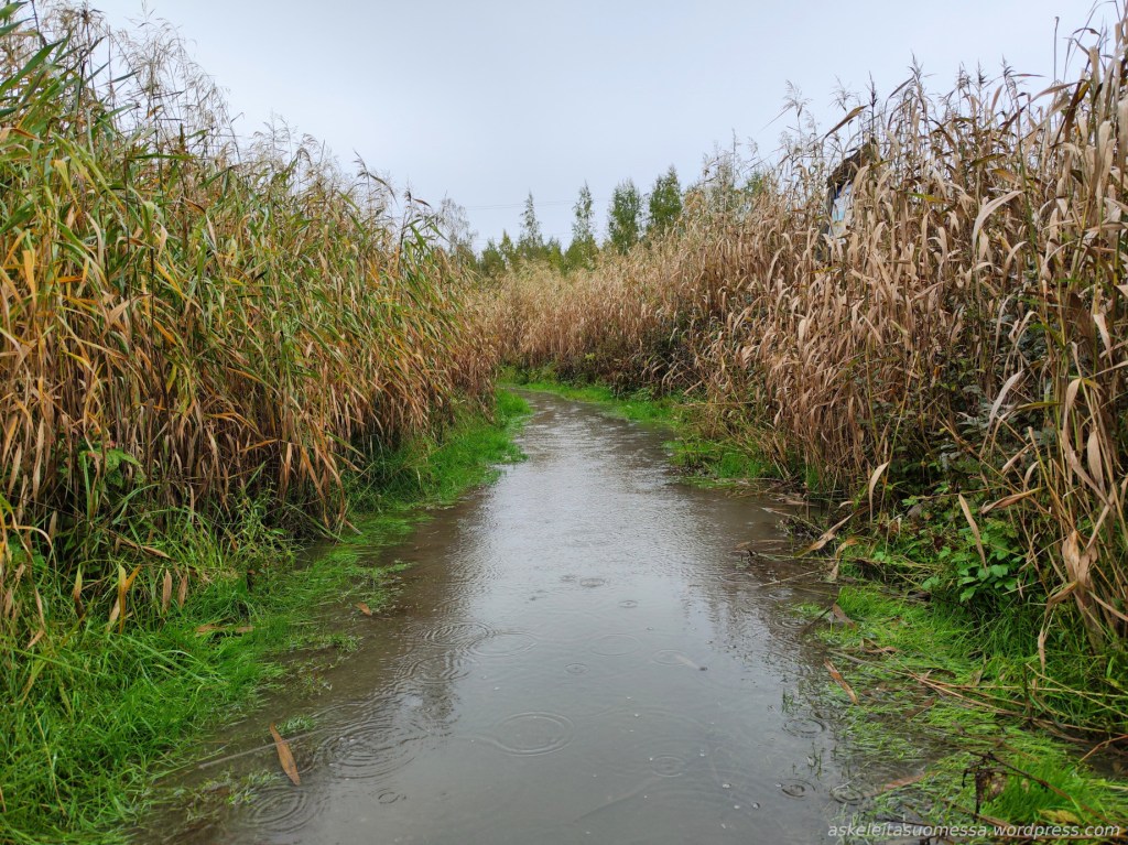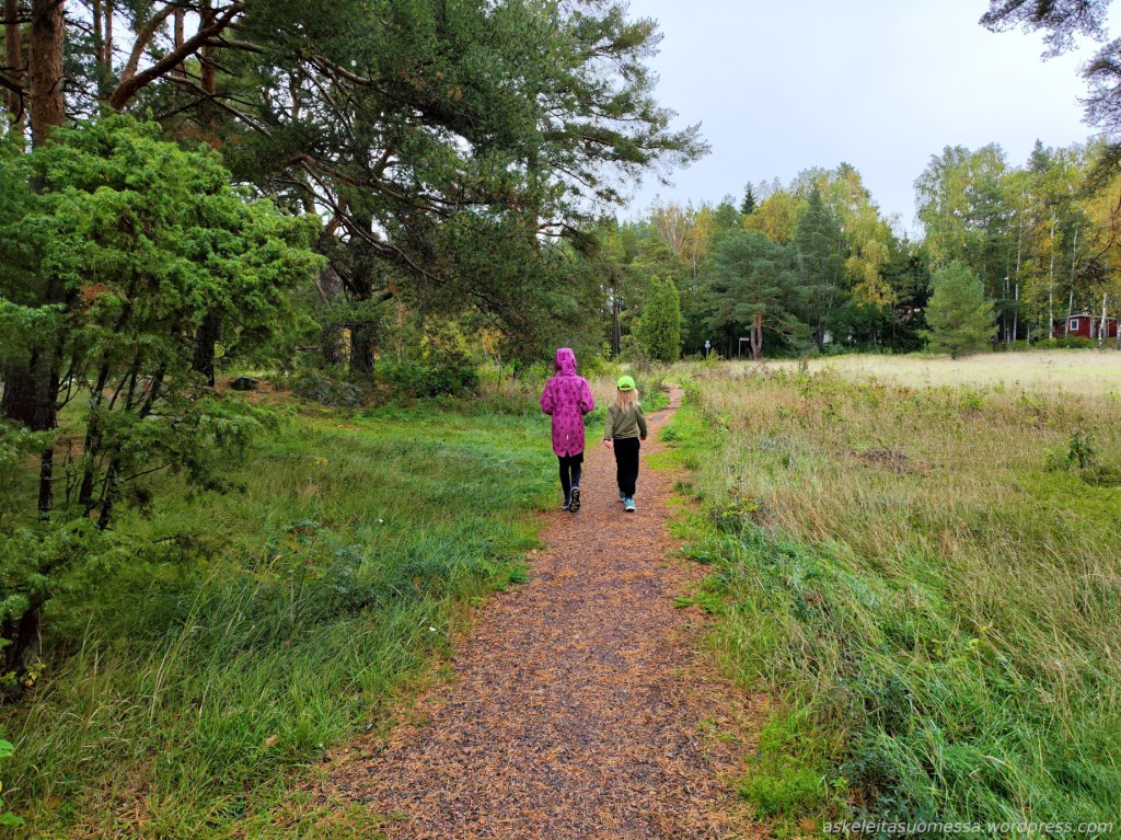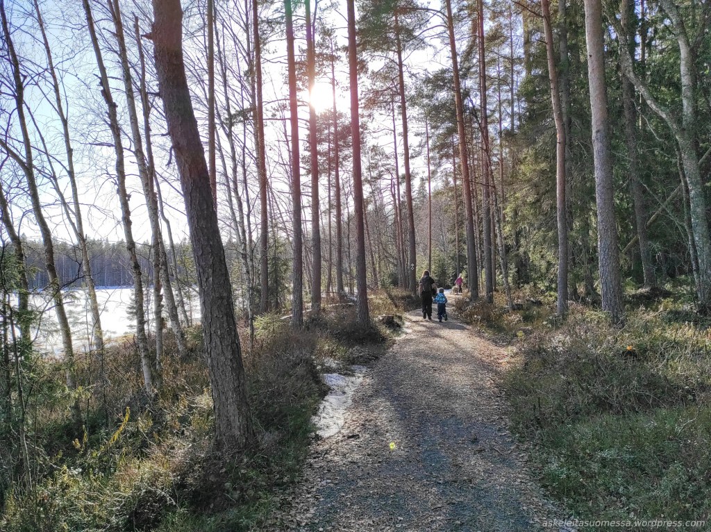 Vaikeus: Helppokulkuinen, suurimmaksi osaksi esteetöntä leveää sorapolkua (eli pääsisi esim. lastenrattaiden kanssa), mutta reitillä on myös kapeampia polkuja. Lisäksi eilen (23.9.) yksi kohta reitistä oli tulvinut ja jouduimme kahlaamaan ilman kenkiä, koska matalavartiset goretex-kengät eivät olleet riittävät.