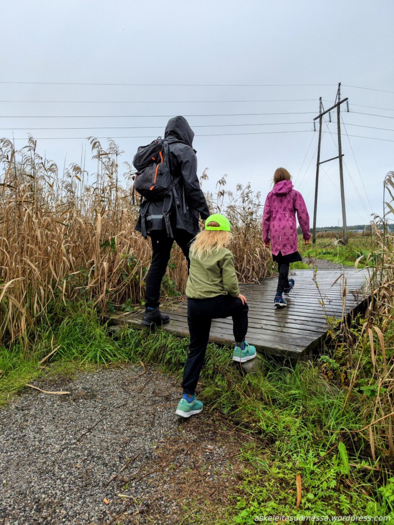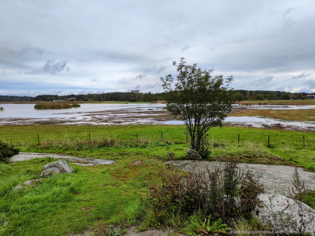 Kävimme aluksi Raisionlahden lintutornilla ja lähdimme sen jälkeen kiertämään reittiä myötäpäivään. Ilmeisesti suositeltu kiertosuunta olisi vastapäivään, mutta meidän valinta oli tässä tapauksessa hyvä, koska tulvinut polkuosuus oli silloin vasta reitin lopussa.
