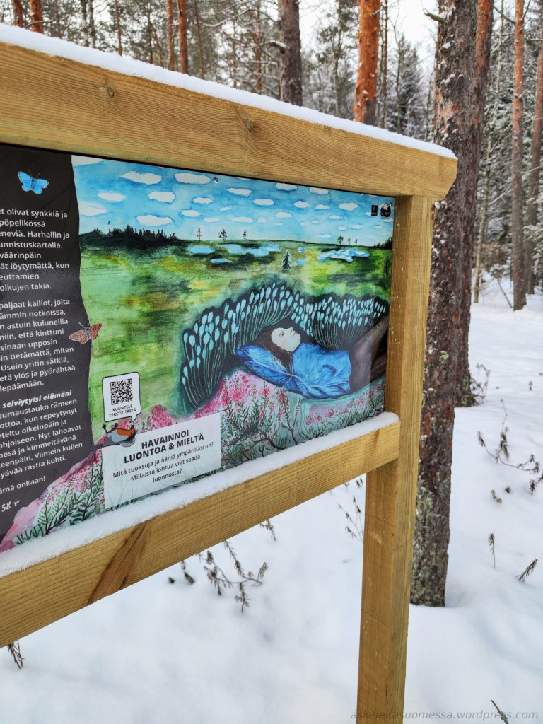 Luontopolun varrella on yhdeksän taideteosta ja toivon tarinaa, joiden yhteydessä on myös luonnon ja mielen havainnointiin liittyviä pohdintatehtäviä. Voit lukea Mielenreitistä lisää: outdoorstampere.fi.