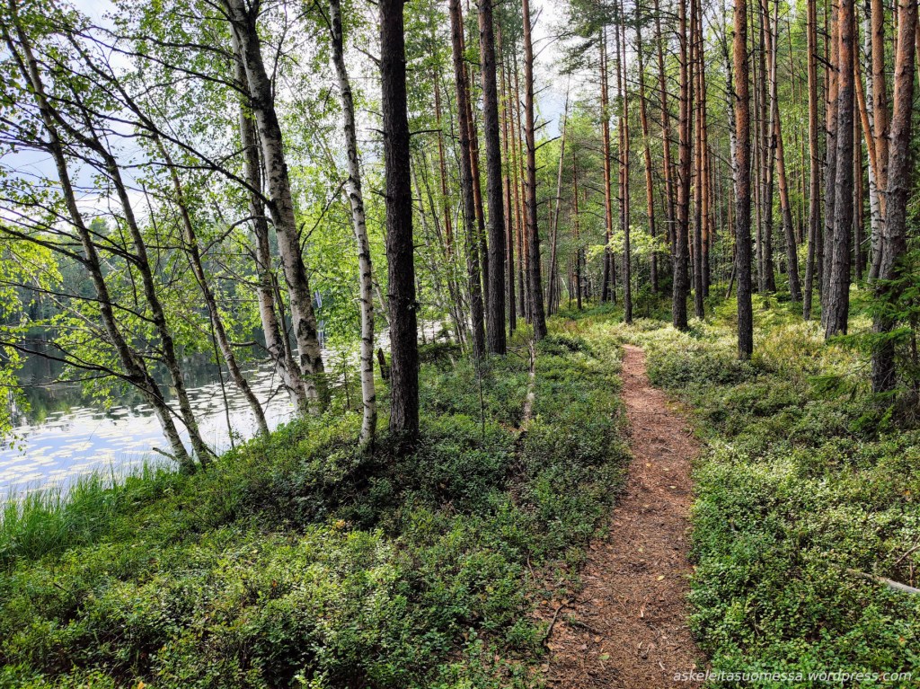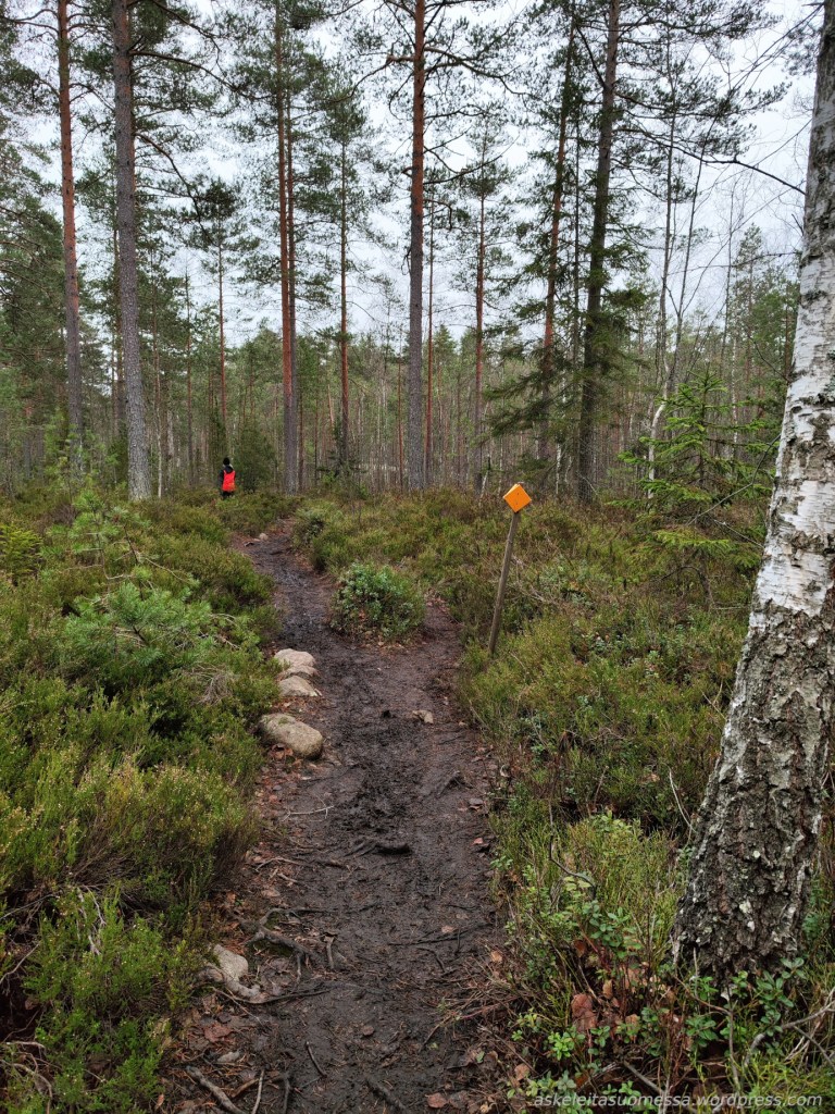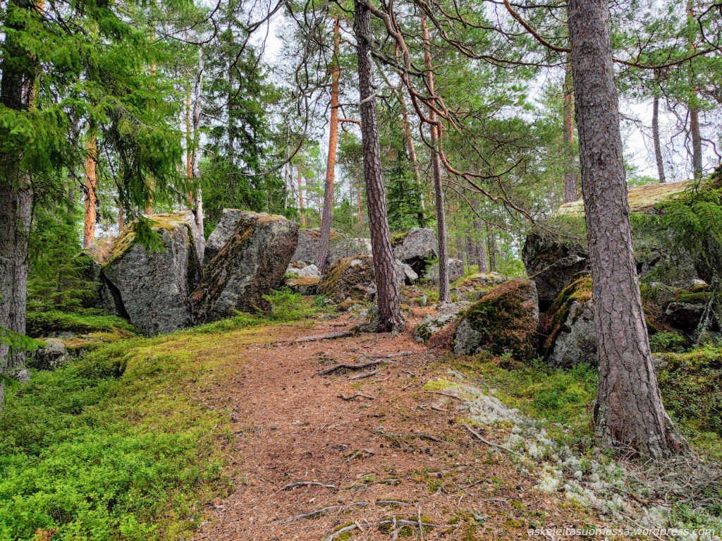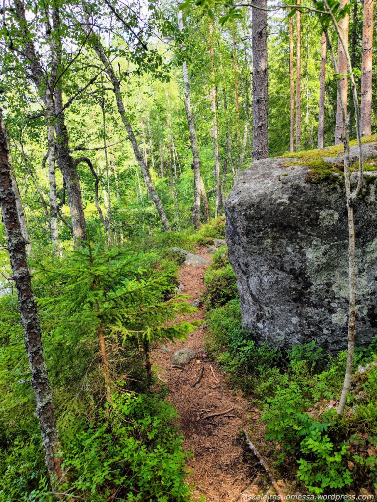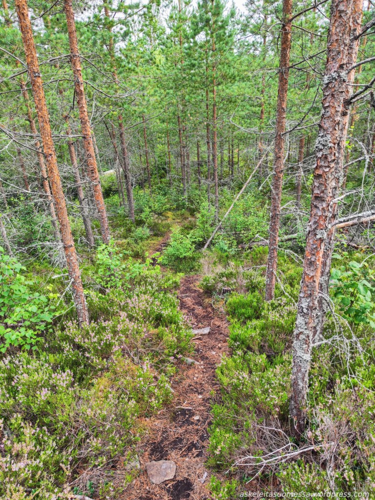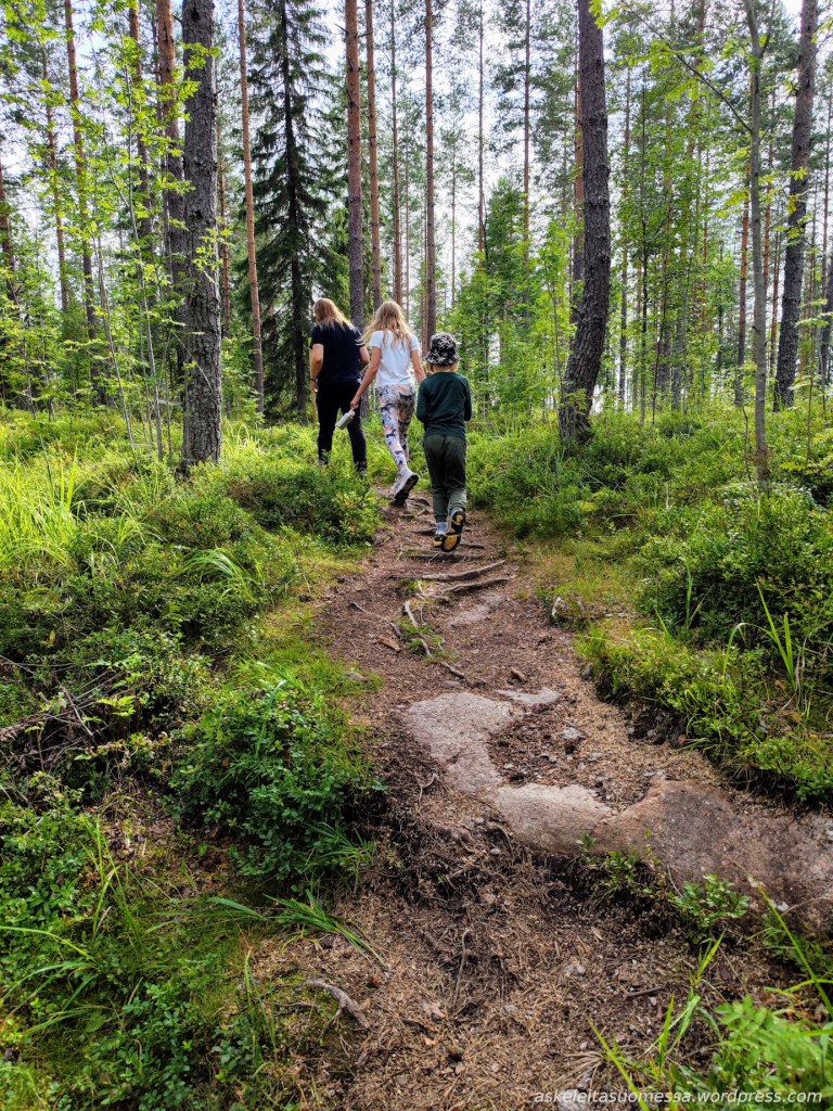Vaikeus: Yleisesti ottaen helpohkoja metsäpolkuja, mutta toki jotkut polut ovat erittäin kivikkoisia ja suoalueilla ei mene pitkospuita eli vedenkestävät kengät olivat pakollinen varuste näin kesäaikaankin.