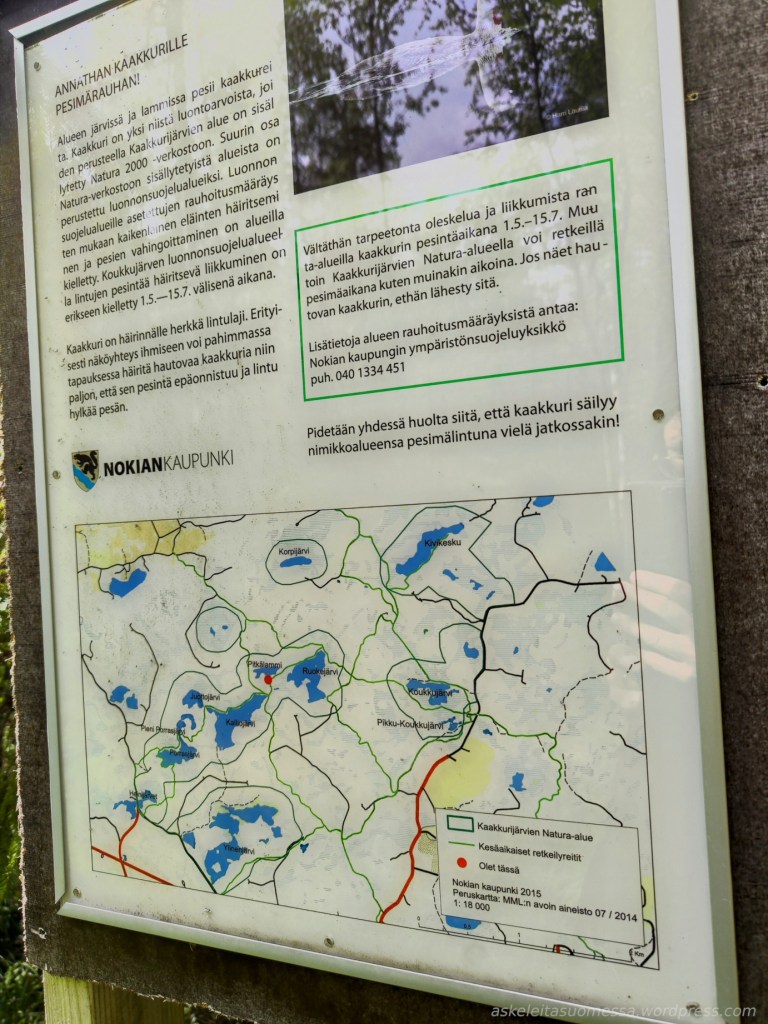 Sijainti: Kyseessä on isohko alue, joka on monien eri pienten järvien ja lampien muodostama kokonaisuus Nokialla. Mahdollisia lähtöpaikkoja on useita, itse lähdin Pinsiöntieltä (osoite suunnilleen Pinsiöntie 419, Nokia). Toinen parkkipaikka löytyy esim. Kivikeskun läheltä (osoite: Koukkujärventie 518, Nokia).