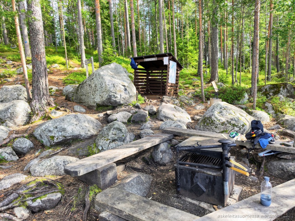 Talvella kävimme Kivikeskulla ja silloin päätinkin, että palaisin tälle seudulle retkeilemään kesäaikaan. Kivikeskun rannalta löytyy pari nuotiopaikkaa, mutta puuvarasto on Koukkujärventien varrella.