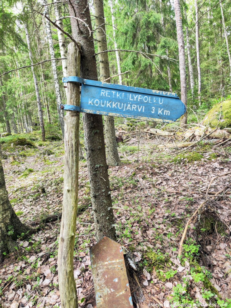 Vanha kyltti ja kuluneet merkinnät puissa paljastavat, että joskus täällä on mennyt merkitty reitti kohti Koukkujärveä. Koukkujärvi kuului omaankin reittisuunnitelmaani, mutta itse tein sinne pidemmän reitin muualta kiertäen eli kuljin tätä polkua vain hetken aikaa.