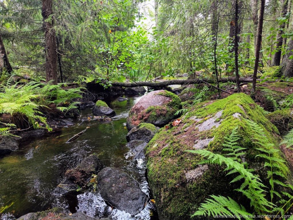 Meidän metsäpolkuun kuuluu veden ylitys lossilla, mutta 27.9.25 täällä käydessäni lossin köysi oli jumissa toisella puolella lahtea enkä siis käynyt toisella puolella. Sieltä pitäisi kartan mukaan löytyä nuotiopaikka.