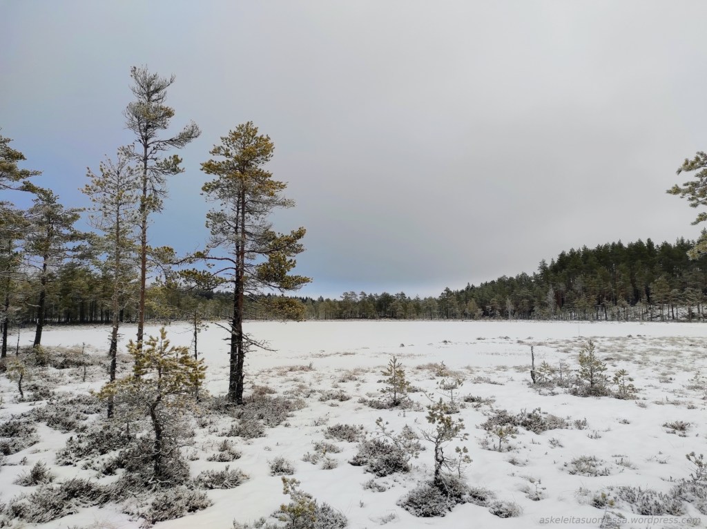 Luontoon.fi kertoo, että Mustalammen nähtävyytenä on ajelehtivat turvelautat, mutta nyt lampi oli vielä jäässä.