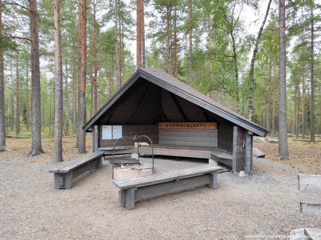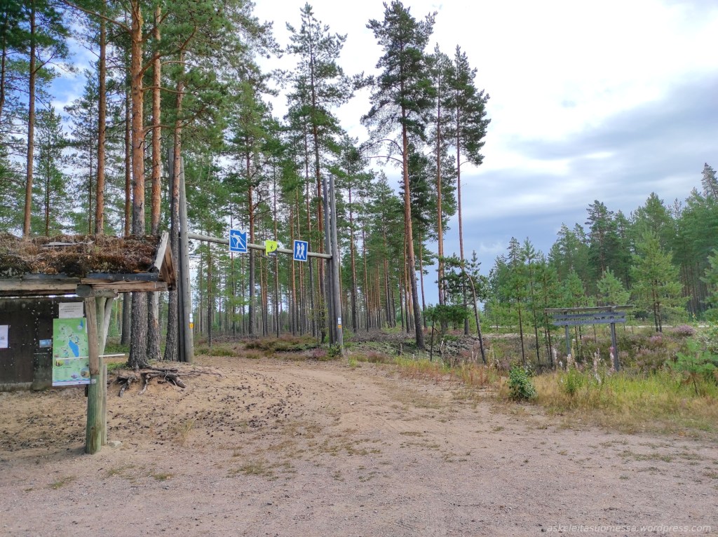 Korpijärveltä kävelin lyhyehkön matkan metsäautotietä Nuijalammen laavulle. Polttopuita näytti olevan nyt melko vähän, mutta itselläni ei suunnitelmia nuotion tekemiseen ollutkaan, vaan jatkoin matkaa kohti Kivikeskua. Kyltit paljastivat, että talvella täällä kulkee hiihtolatuja.