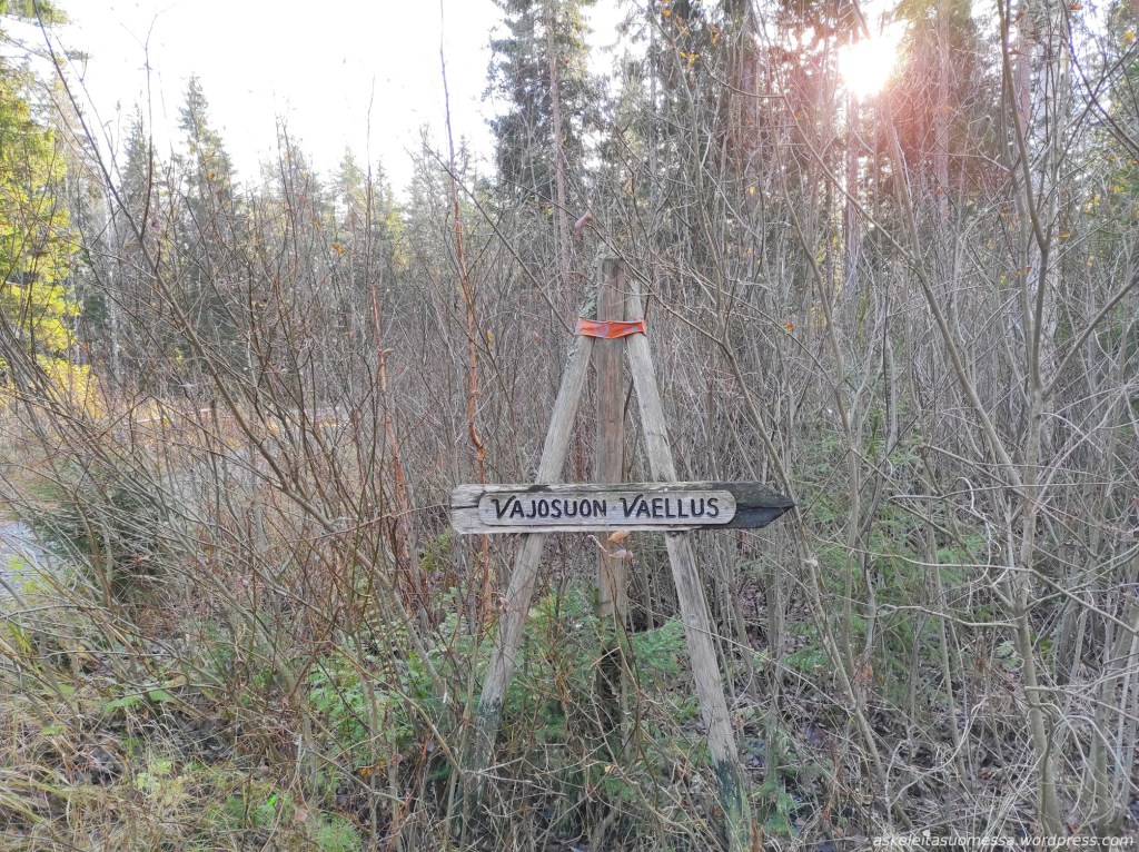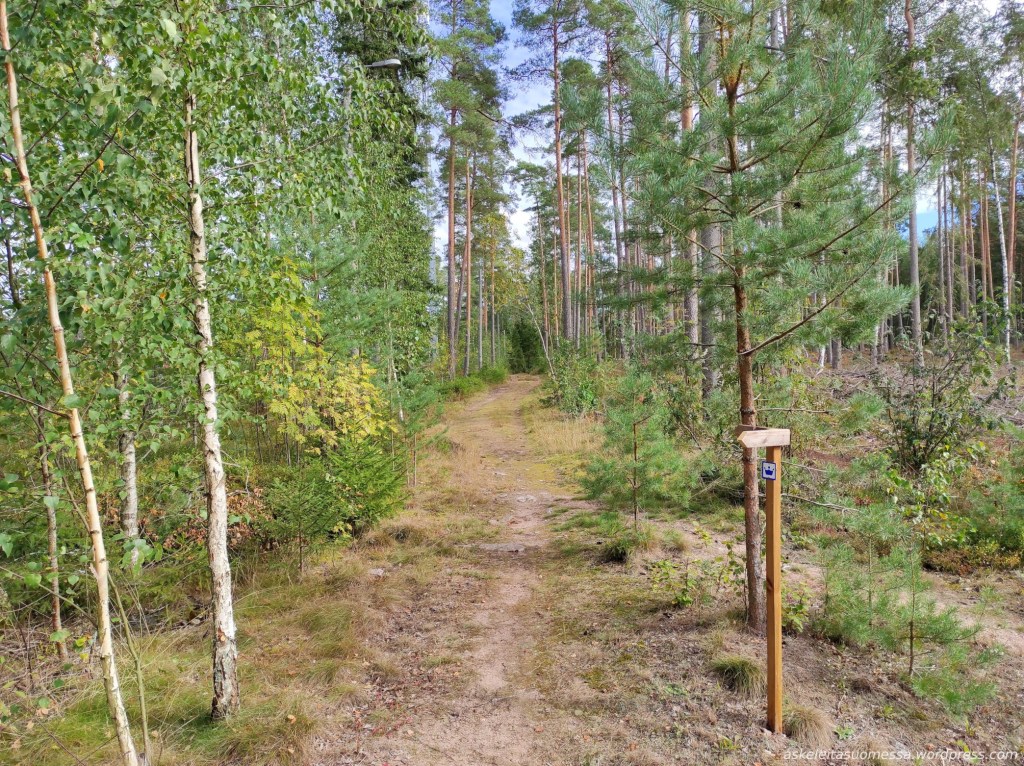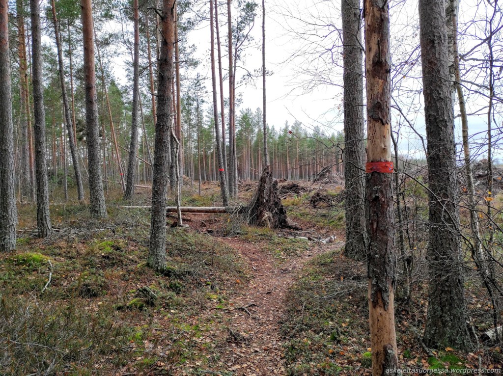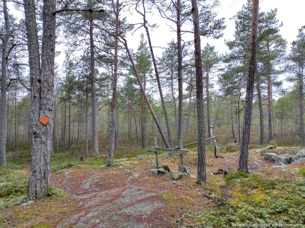 Vanha kyltti ja kuluneet merkinnät puissa paljastavat, että joskus täällä on mennyt merkitty reitti kohti Koukkujärveä. Koukkujärvi kuului omaankin reittisuunnitelmaani, mutta itse tein sinne pidemmän reitin muualta kiertäen eli kuljin tätä polkua vain hetken aikaa.