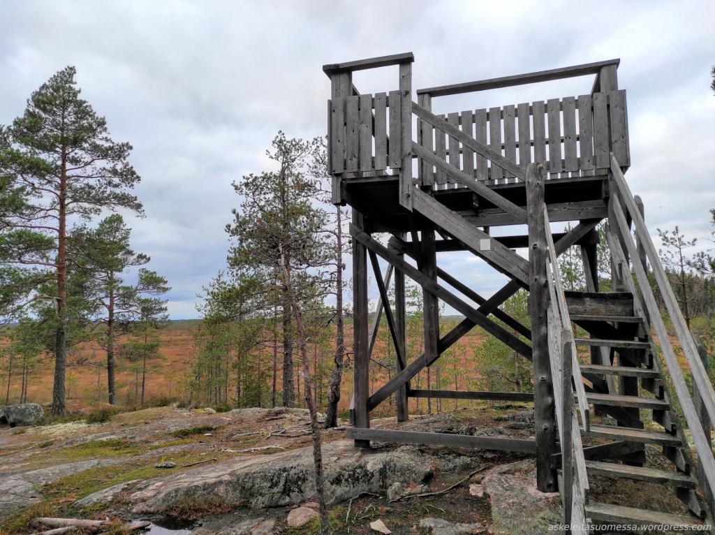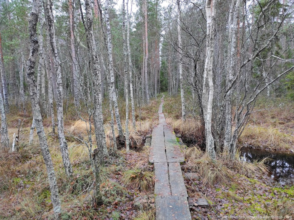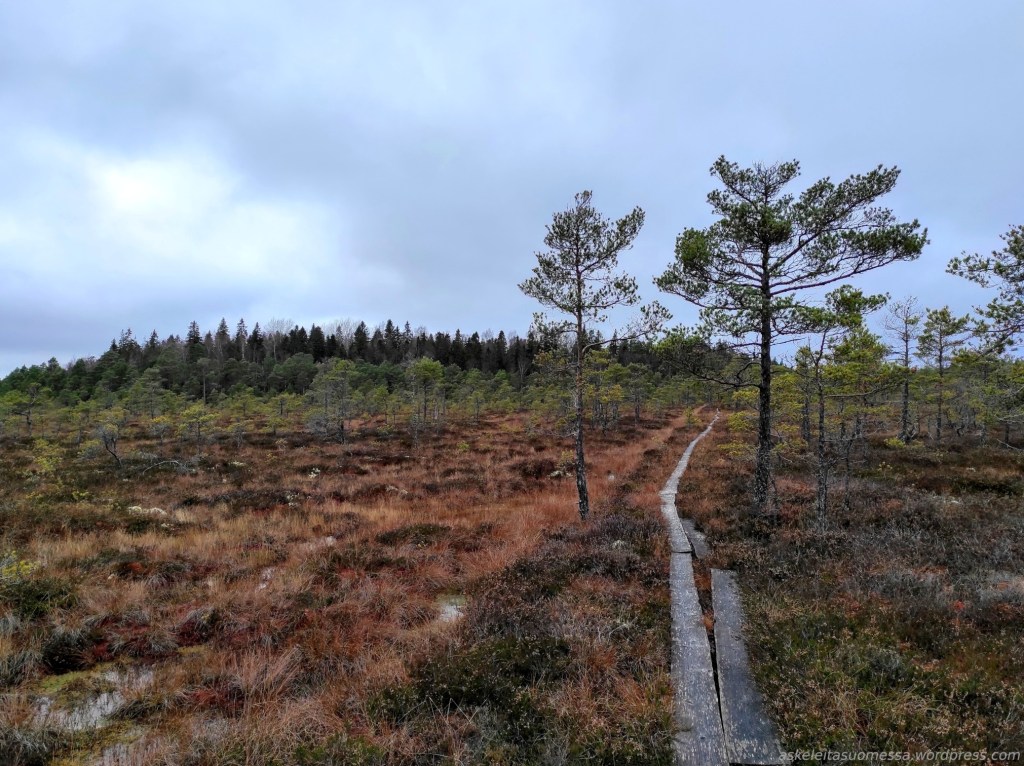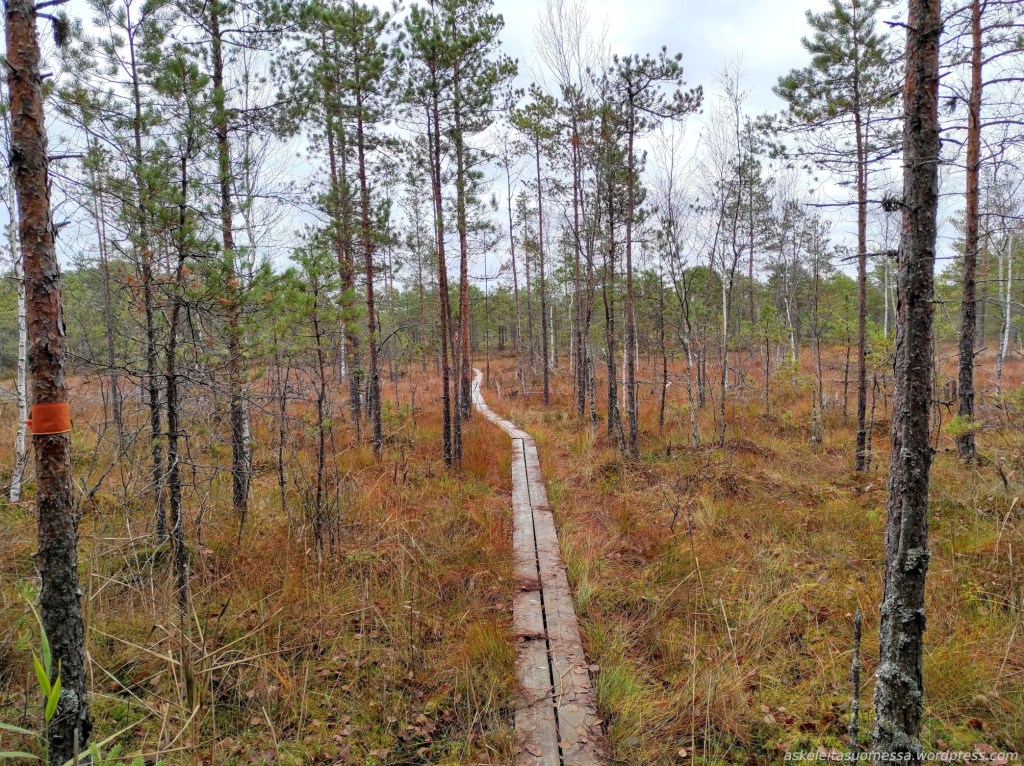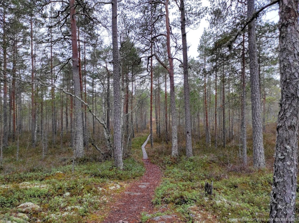 Kuten jo aiemmin todettu, alueella on useita märkiä suokohtia ilman pitkospuita, minkä vuoksi vedenpitävät kengät tulevat tarpeeseen (itse siis pärjäsin hyvin goretex-lenkkareilla).
