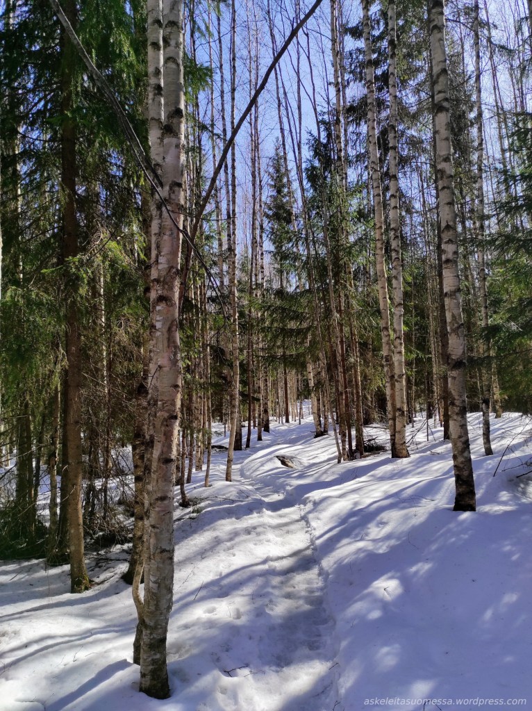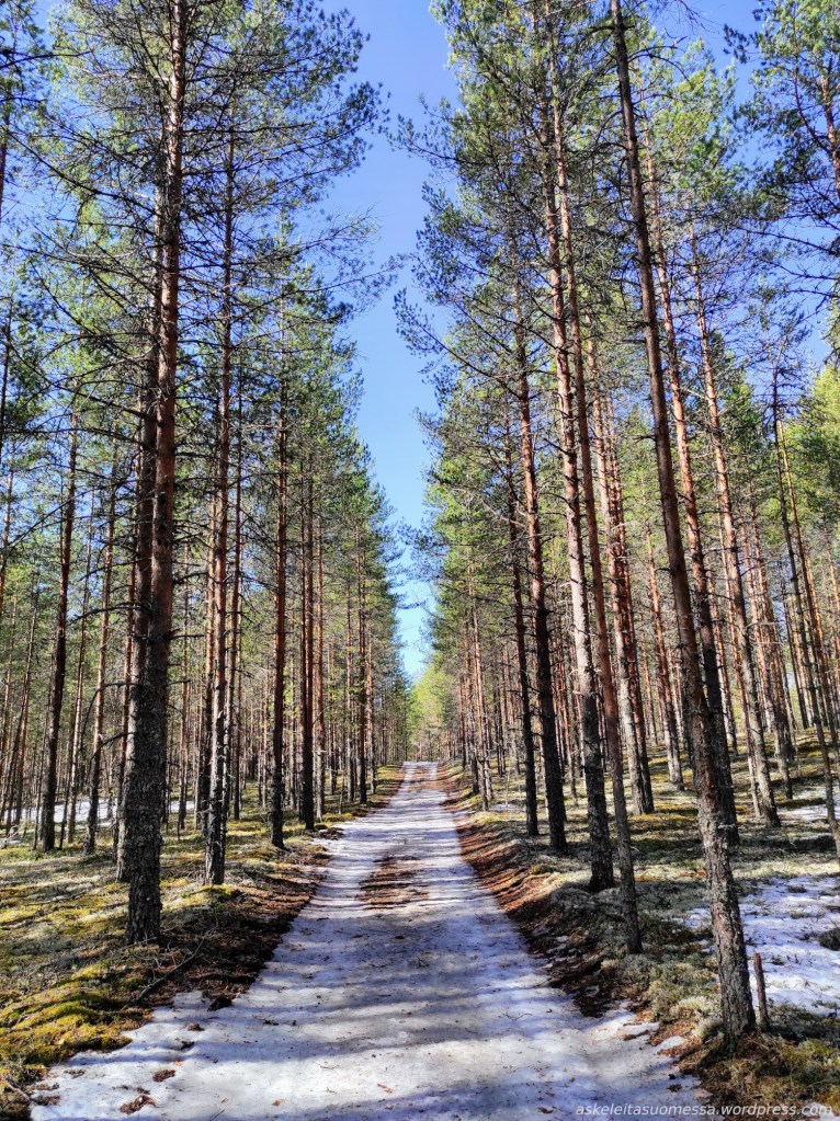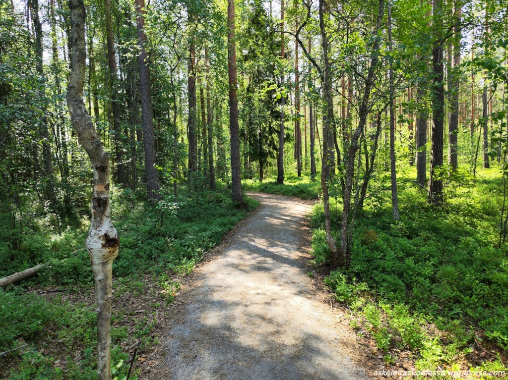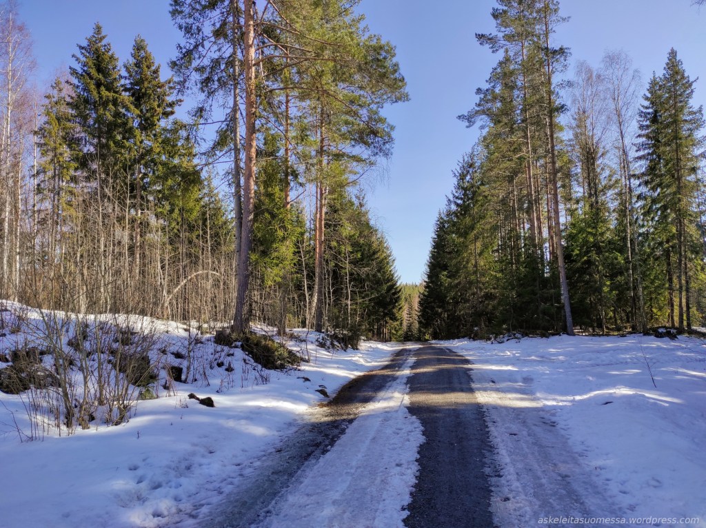 Suo-osuuden jälkeen reitti kulkee pienen matkan autotietä pitkin, kunnes jälleen käännytään metsään.