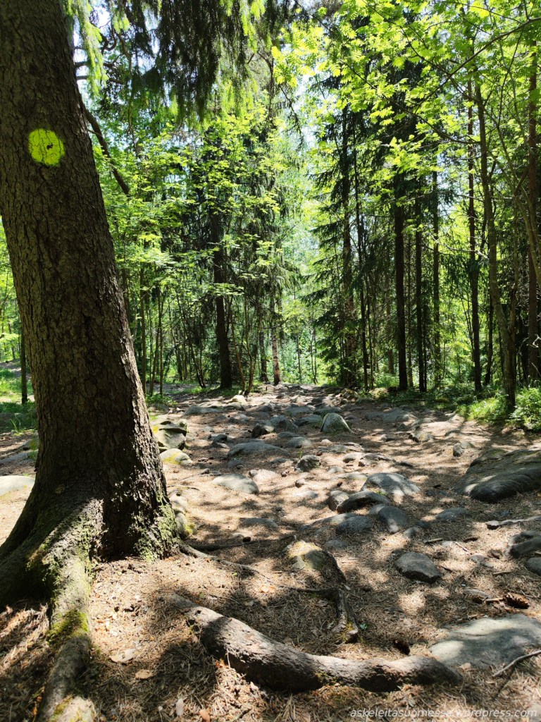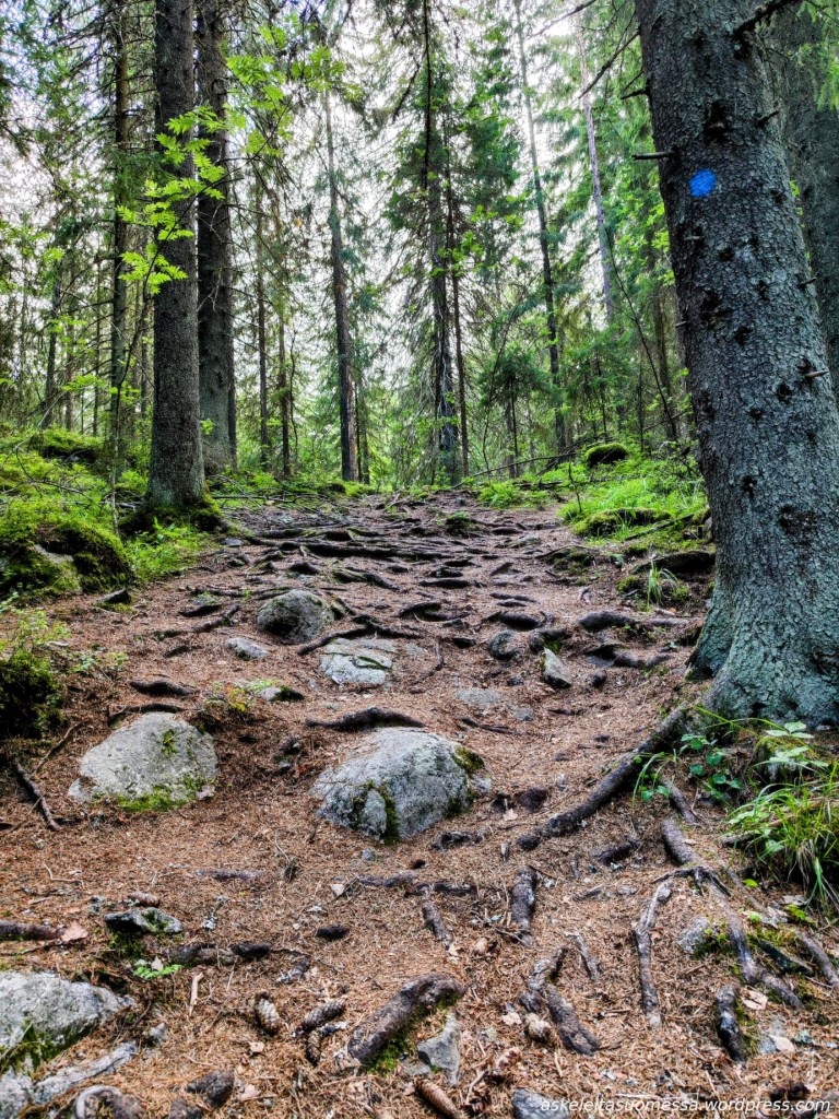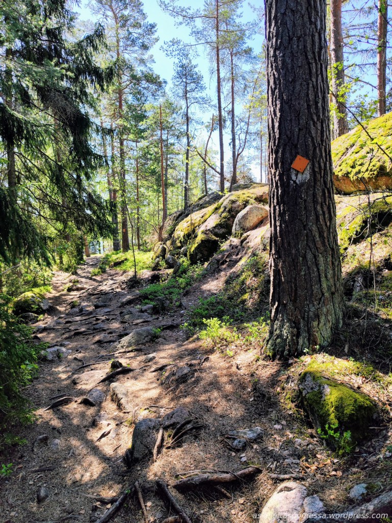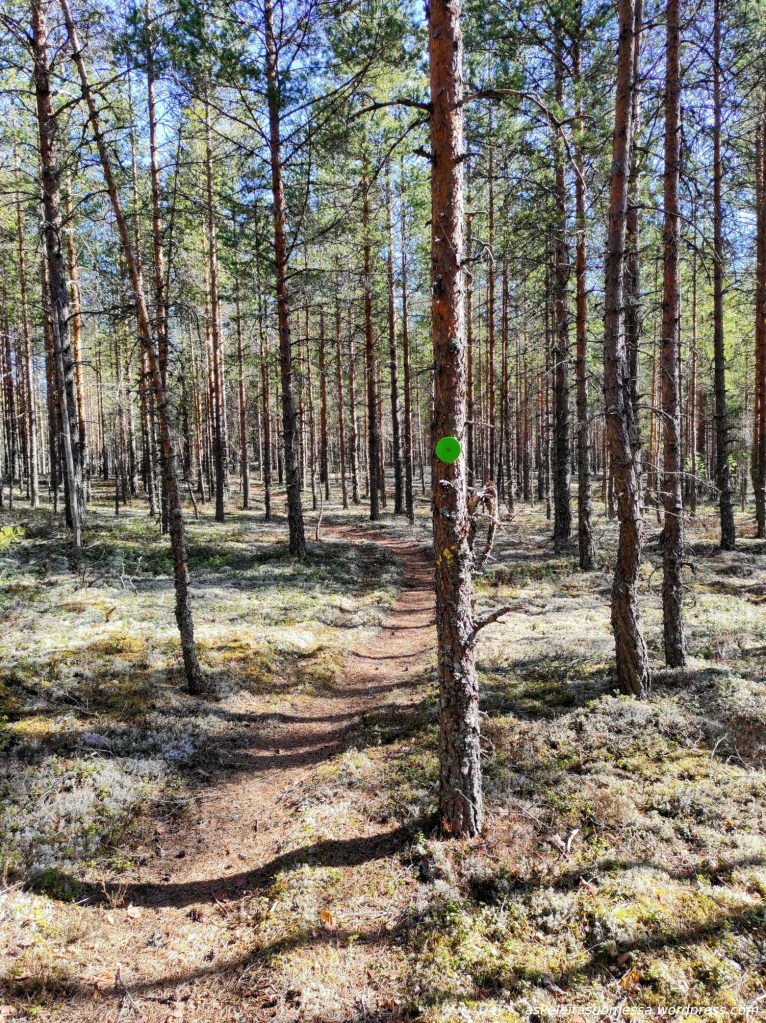 Reitti on merkitty keltaisilla merkeillä puihin, mutta parissa kohdassa kannattaa olla tarkkana, sillä aivan kaikissa kohdissa reittiä ei ollut merkittynä kovin hyvin. Täällä ei toki ole vaaraa siitä, että metsään eksyisi.