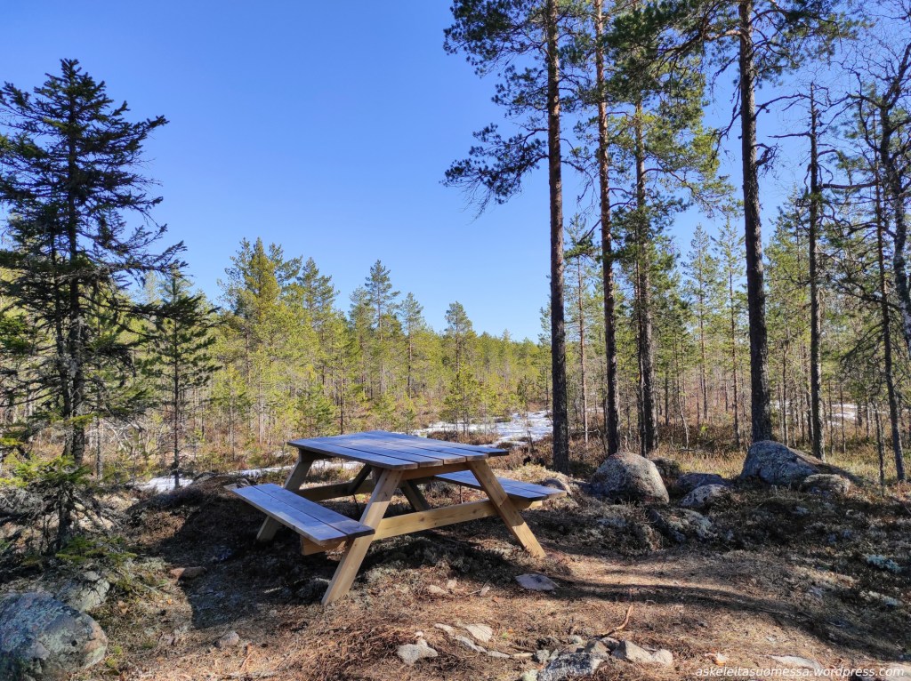 Ennen pitkospuureitin alkamista on pöytä ja penkit, missä voisi pitää tauon reitin aluksi tai lopuksi. Myös reitin puolivälissä on taukopaikka. Nuotiopaikkaa ei tältä kierrokselta löydy lainkaan.