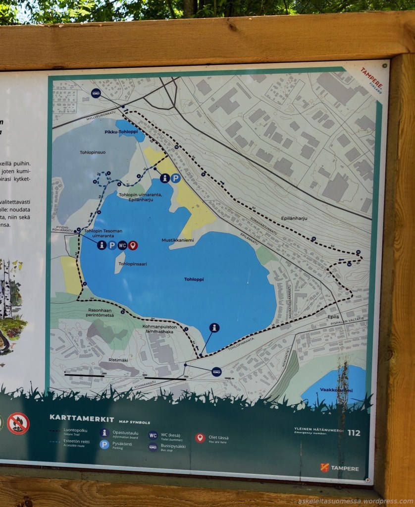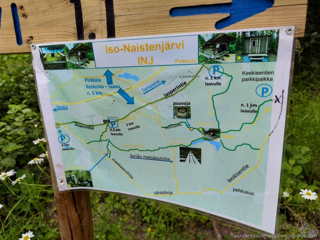 Reitin pituus: Paljon erilaisia mahdollisuuksia, sillä alueella kulkee paljon erilaisia polkuja. Me teimme noin 8 km:n rengasreitin, katso reitti trailmapista (tämä jälkikäteen tehty uudelleen trailmappiin, joten ei ehkä ihan juuri näin mennyt). Keskisentieltä Iso-Naistenjärven rannalla sijaitsevalle laavulle on vain noin 1 kilometrin matka per suunta, jos etsii lyhyttä reittiä lasten kanssa tehtäväksi. Alueella kulkee merkitty Iso-Naistenjärven luontopolku, mutta sen pituus ei käynyt aivan selväksi, sillä kuljimme sitä vain osaksi. Kyseisen reitin varrella on puihin kiinnitettyjä Pirkkala-seuran luontotauluja.