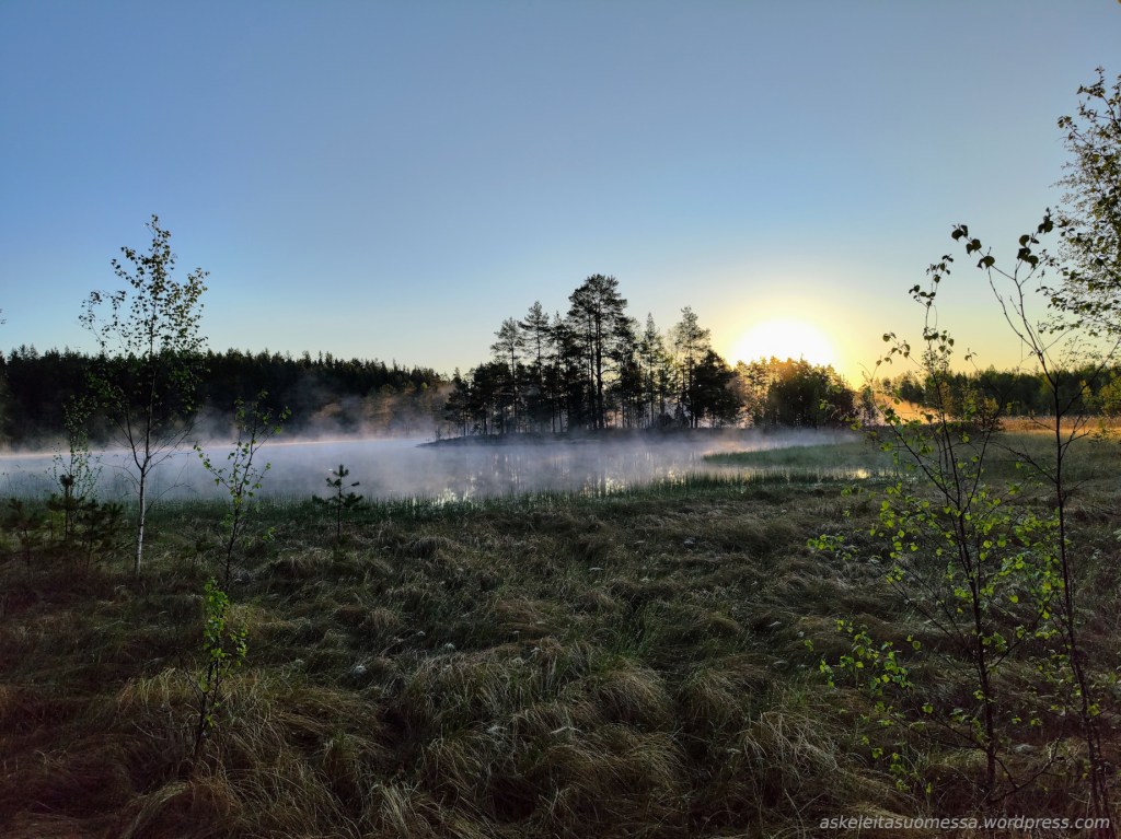 Roosinniemi sopi meille hyvin telttailuun, sillä parkkipaikalta on alle kilometrin pituinen matka kantaa lasten kanssa tarvittavia varusteita. Alueelta löytyy laavu, nuotiopaikka ja puucee sekä upeat näköalat Matildanjärvelle. Sumuinen järvi oli auringonnousun aikoihin nyt toukokuussa lumoavan upea (enemmän kuvia instassa)!