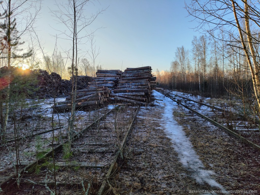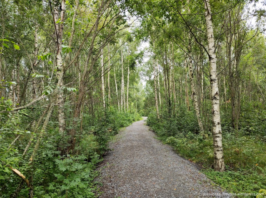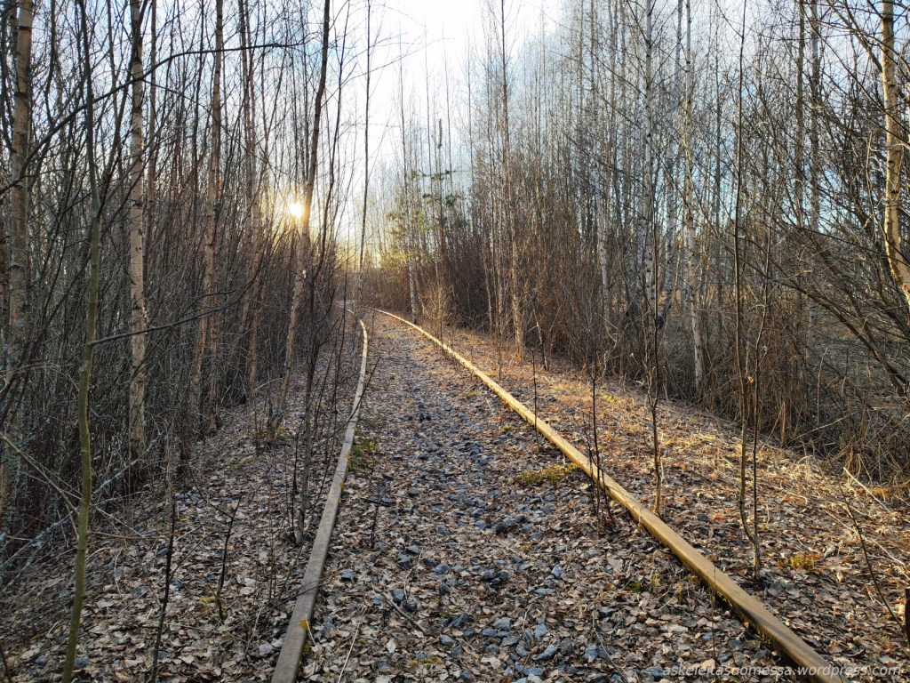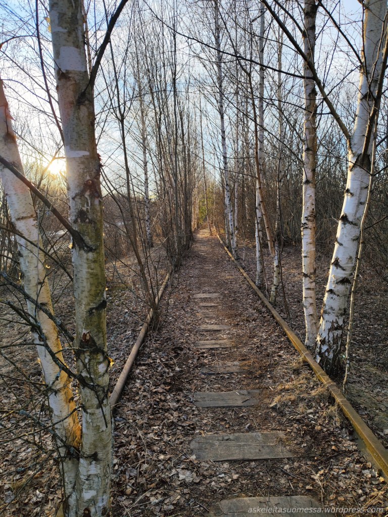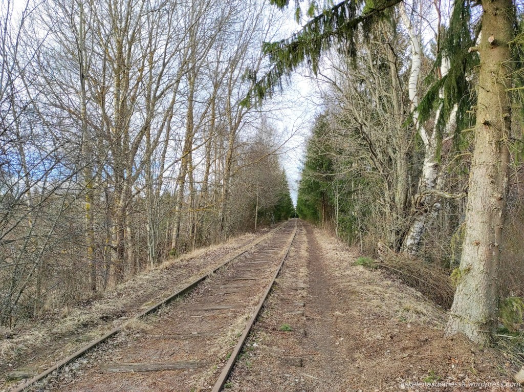 Tämä alun rataosuus on kasvanut jo täyteen puita, mutta raiteiden vieressä kulkee siis hyväkuntoinen polku.