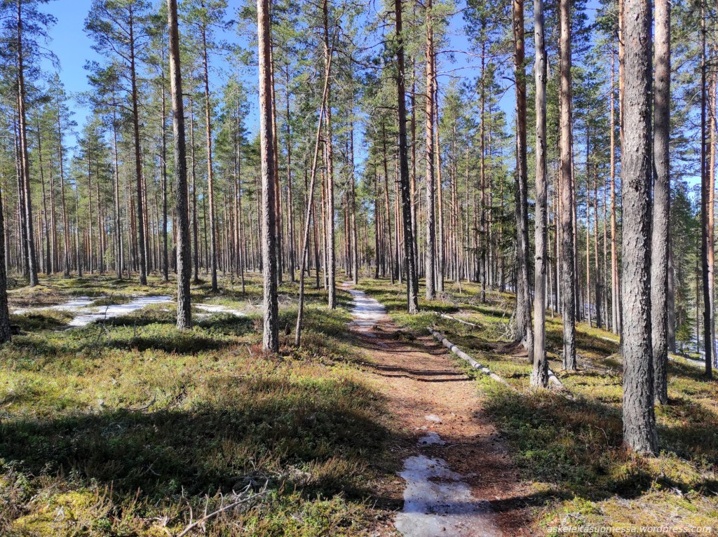 Savottapolku suuntaa kohti Latokuusikkoa, joka on rajoitusaluetta eikä lumettomana aikana ole sallittua liikkua kuin polulla.