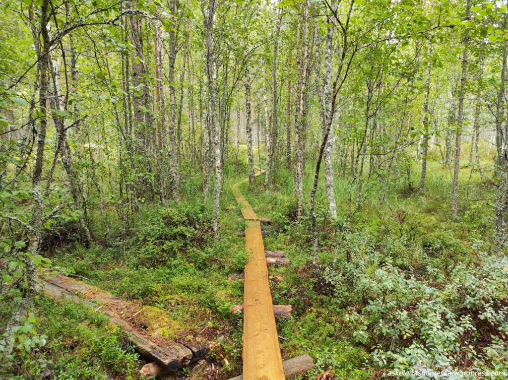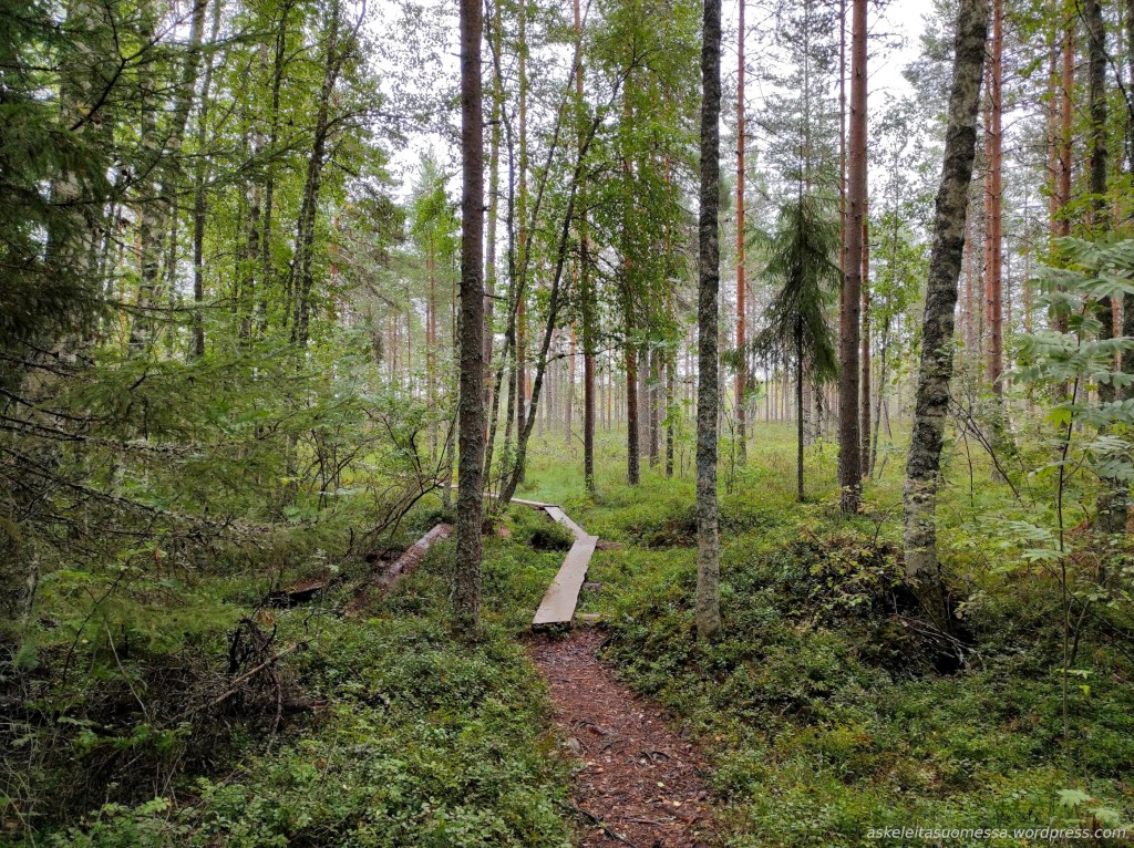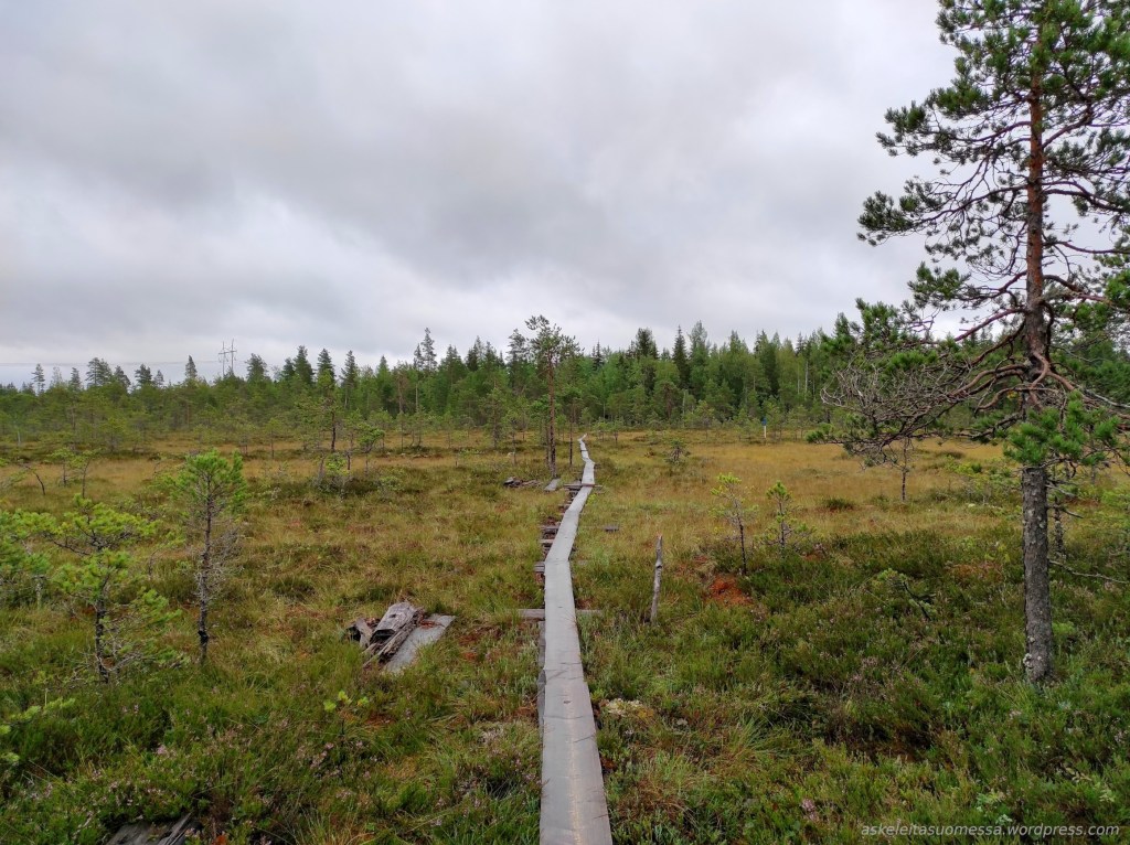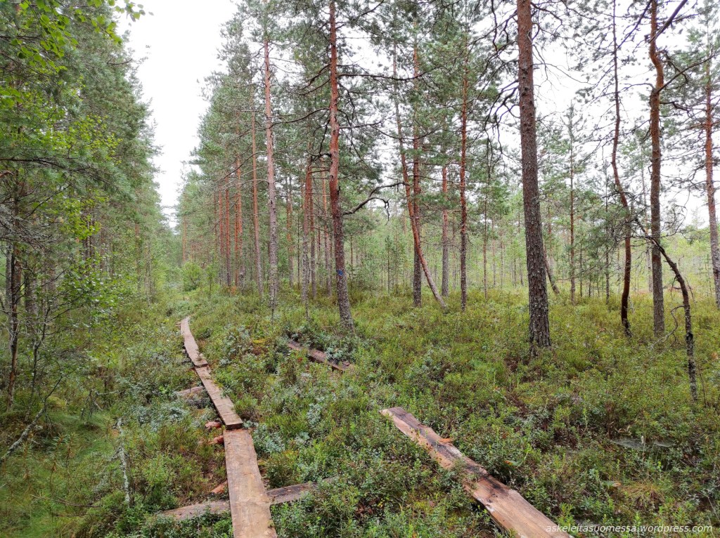 Katajamäen reitti kulkee välillä metsäpolkuja, välillä suolla pitkin kapeita pitkospuita.