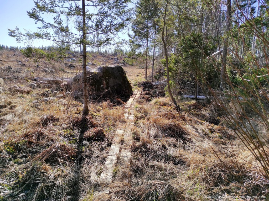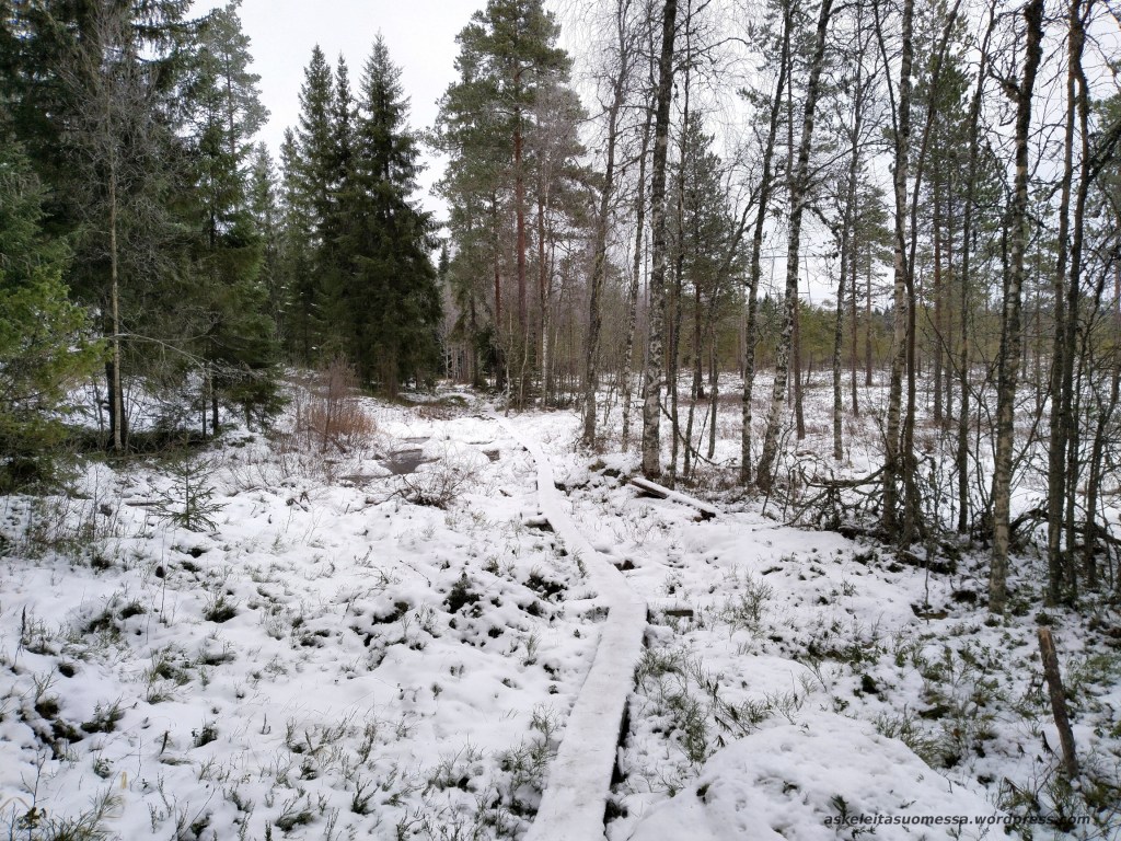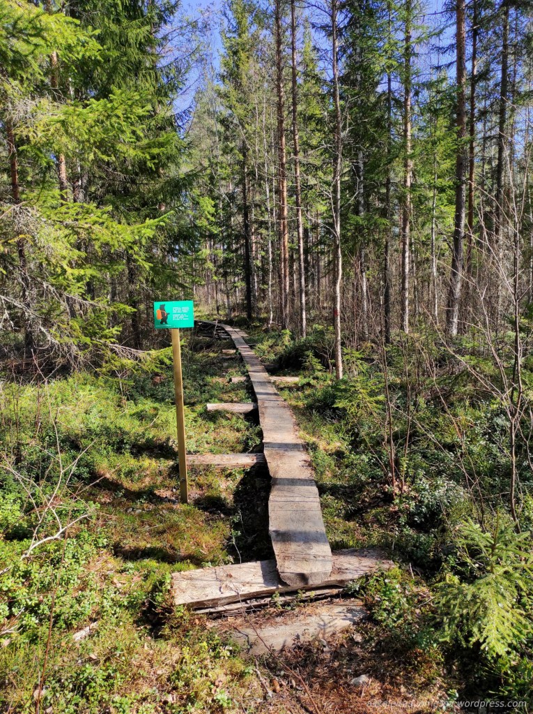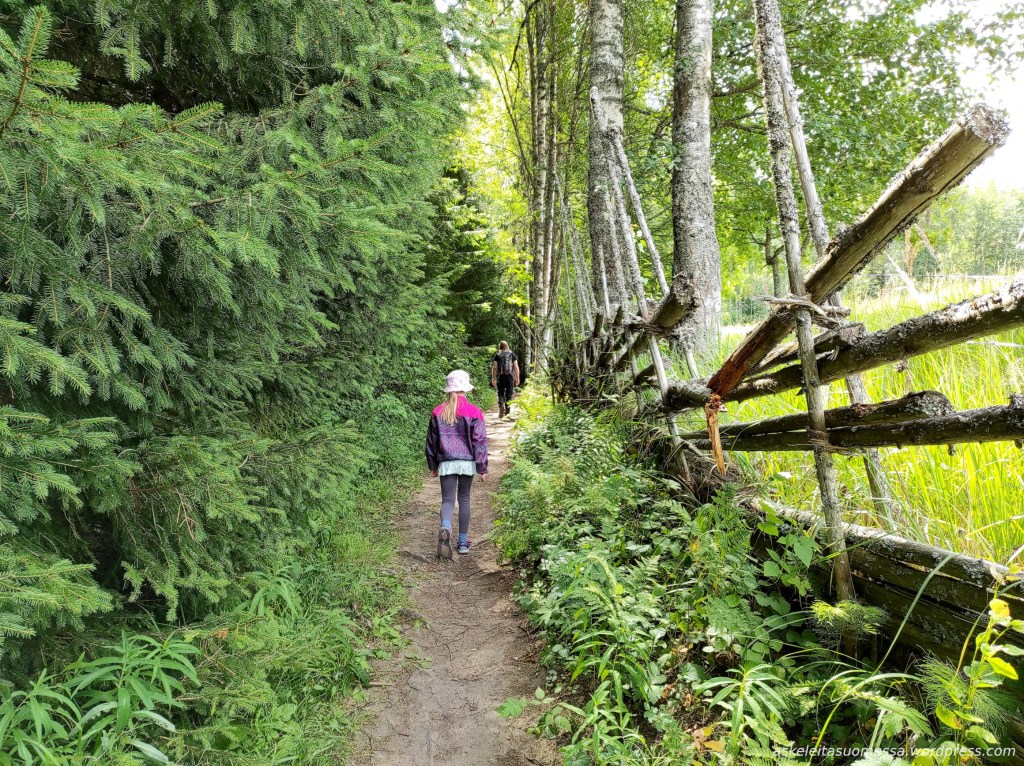 Katajamäen reitti kulkee välillä metsäpolkuja, välillä suolla pitkin kapeita pitkospuita.