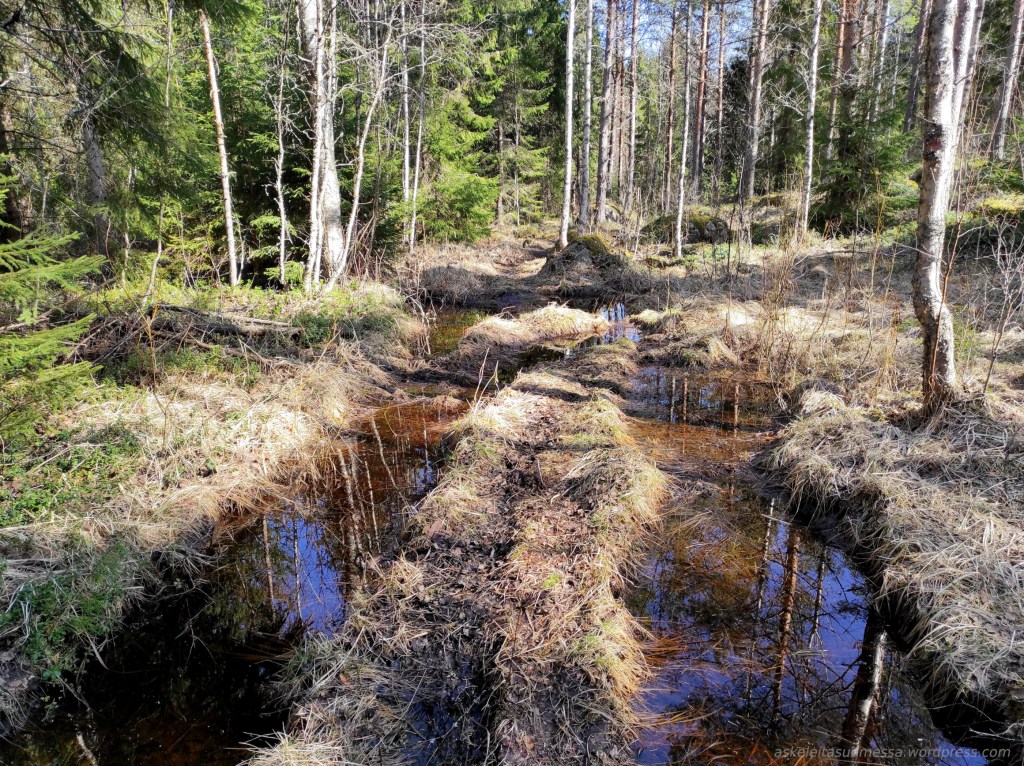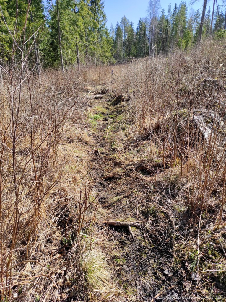 Kirkkoniitulta Kellahden rantatielle menevä reittiosuus oli monesta kohtaa vaikeasti kuljettava ainakin näin keväällä, koska maasto oli hyvin märkää vanhojen metsäteiden kohdalta. Näitä väistellessä etenemisnopeus oli meillä melko hidas…