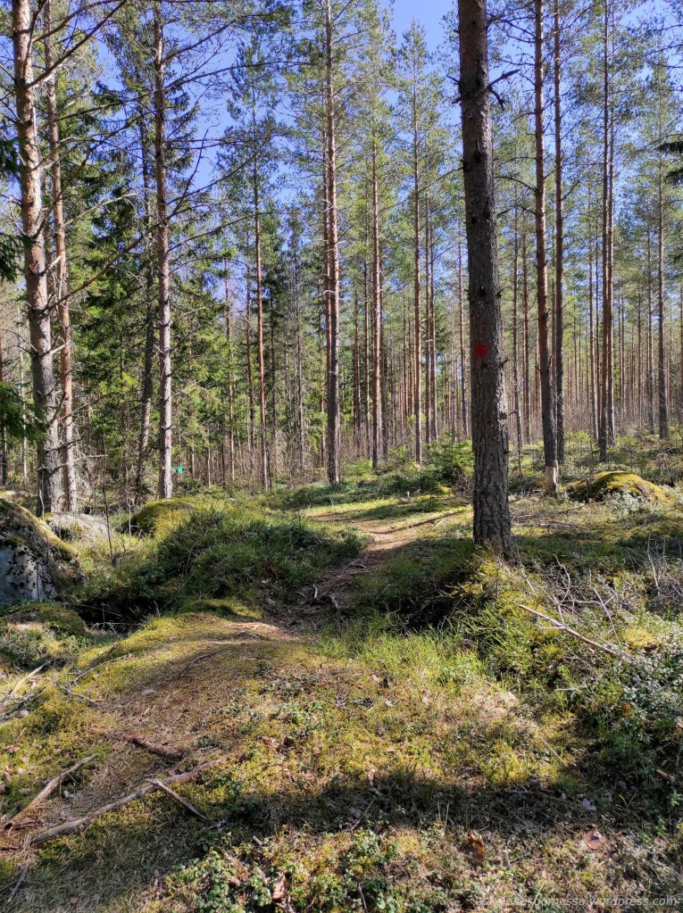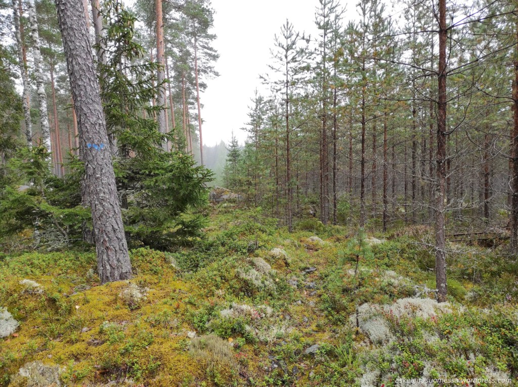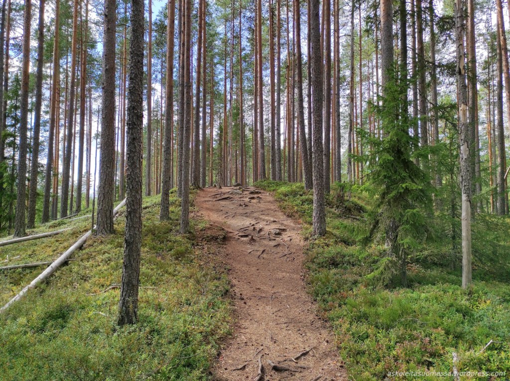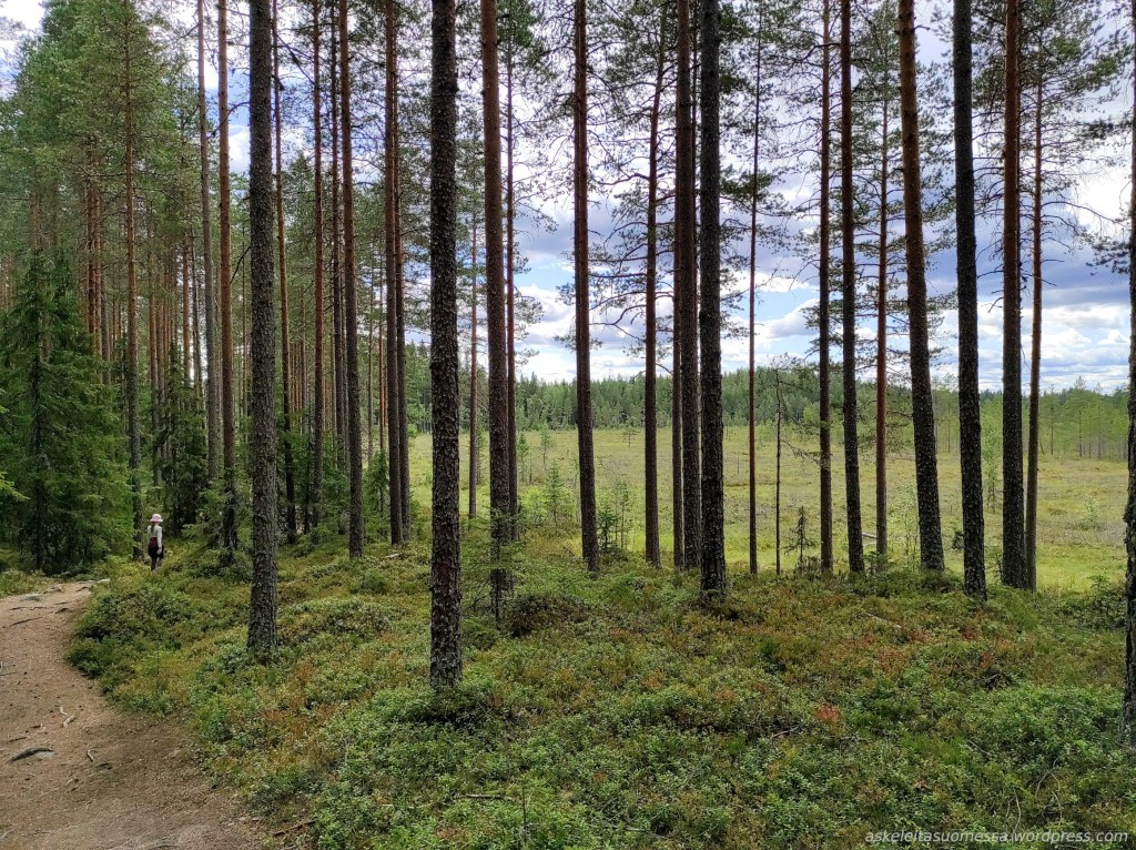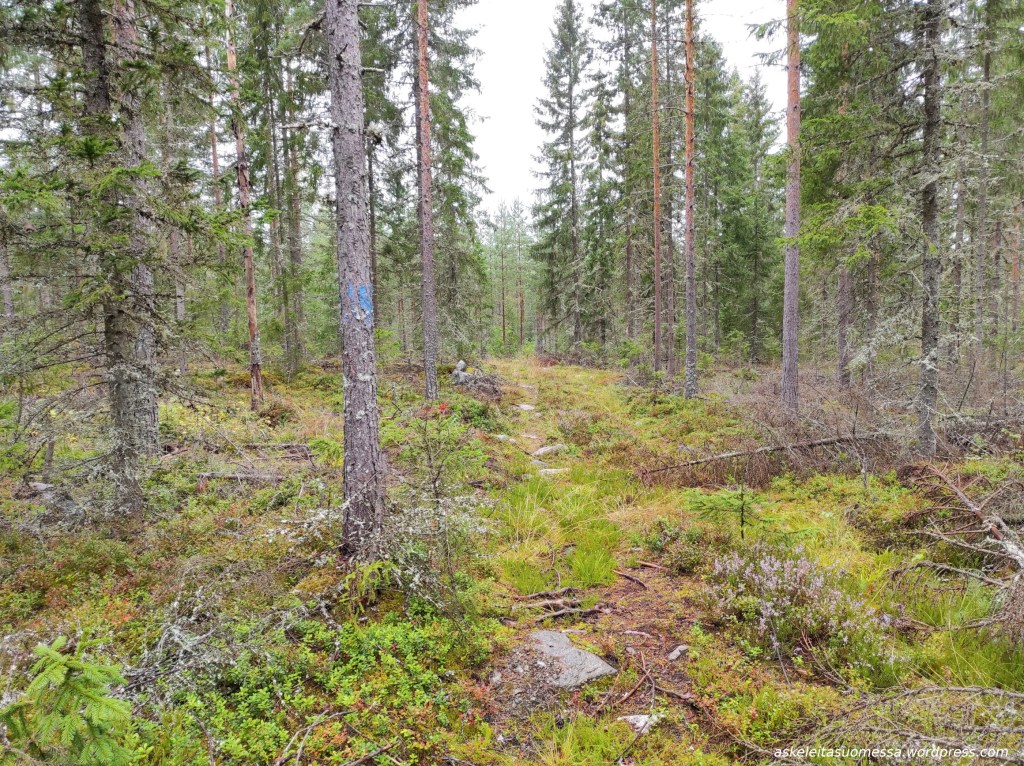 Seuraavat kuvat ovat väliltä Katajamäen laavu – Saloniementie. Polku oli kesällä selvästi näkyvissä, mutta reittimerkit melko kuluneet.