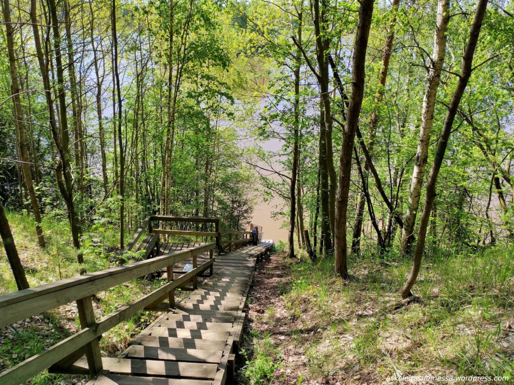 Kolvaantörmän uimarantaan pääsee alas portaita pitkin. Seuraavan kuvan ottohetkellä toukokuussa vesi oli korkealla, joten hiekkaranta ei ole siinä näkyvissä.