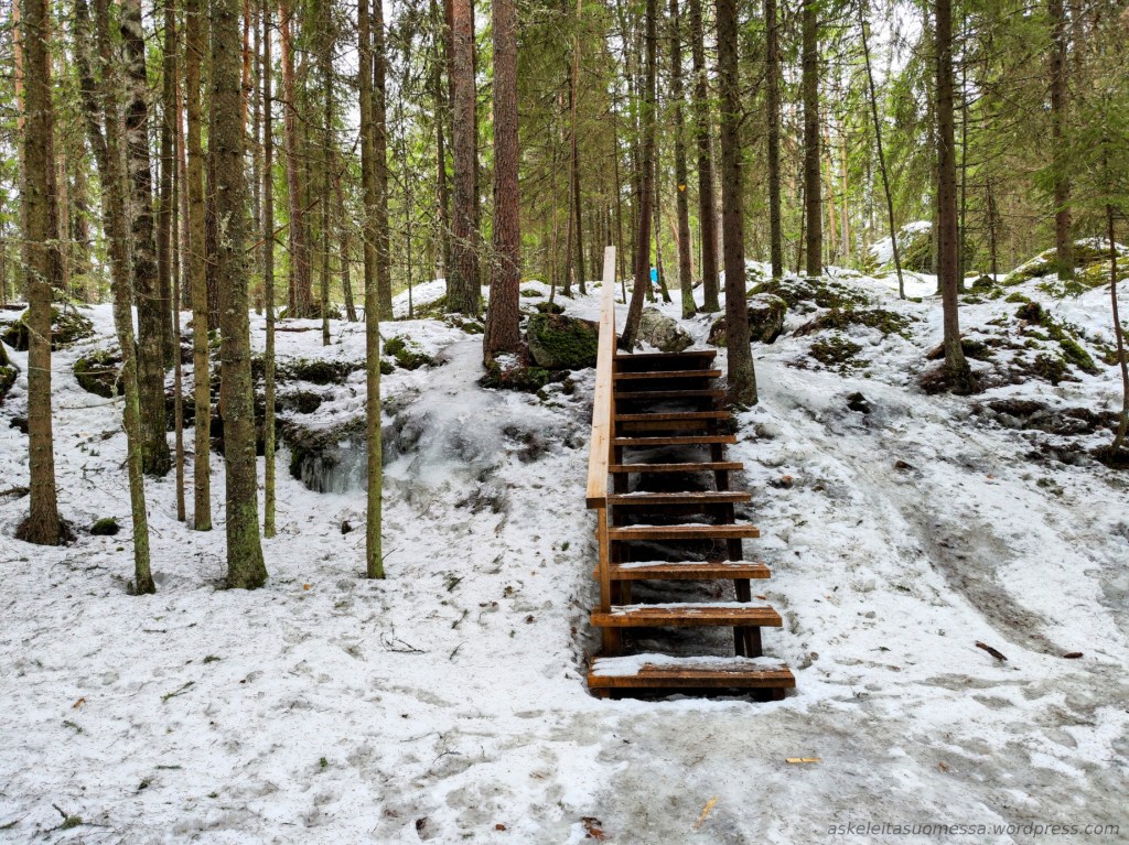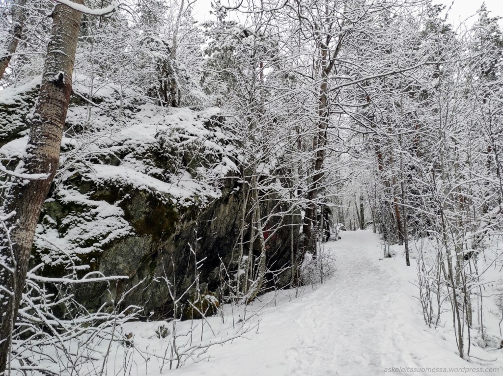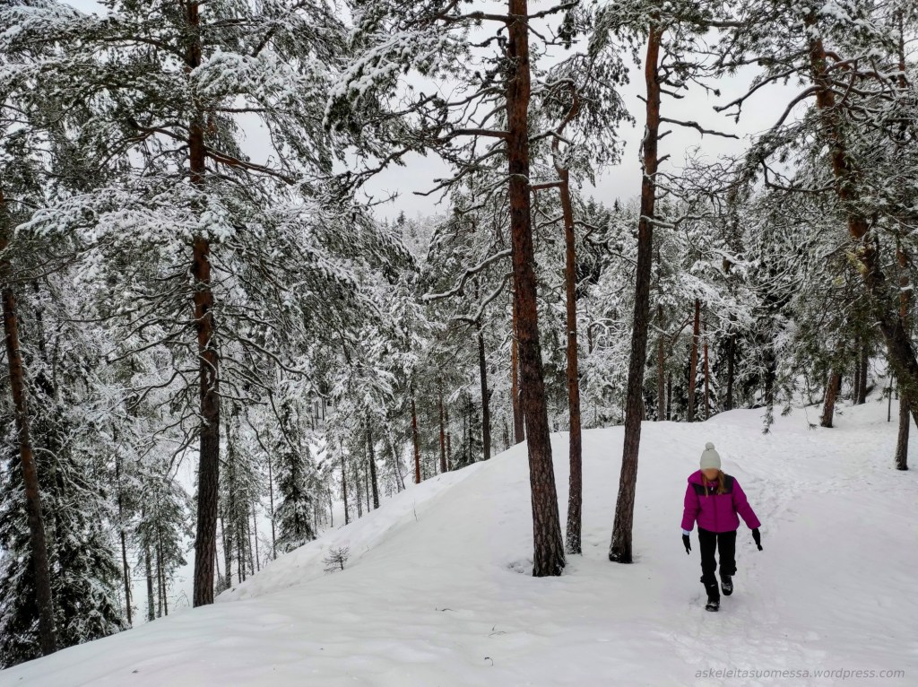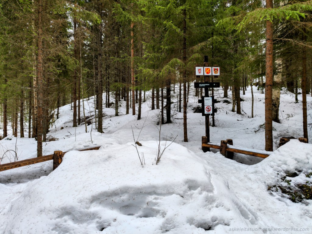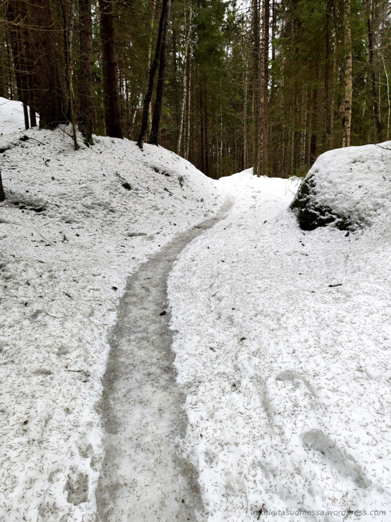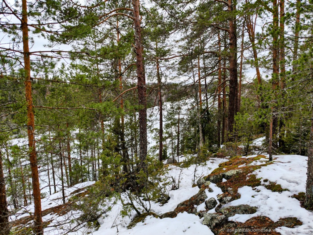 Vaikeus: Helppokulkuinen, hieman korkeuseroja kallioille nousemisten vuoksi. (Lunta oli vielä paljon nyt 24.3.24, mutta polut olivat siis hyvin tallautuneet.)
