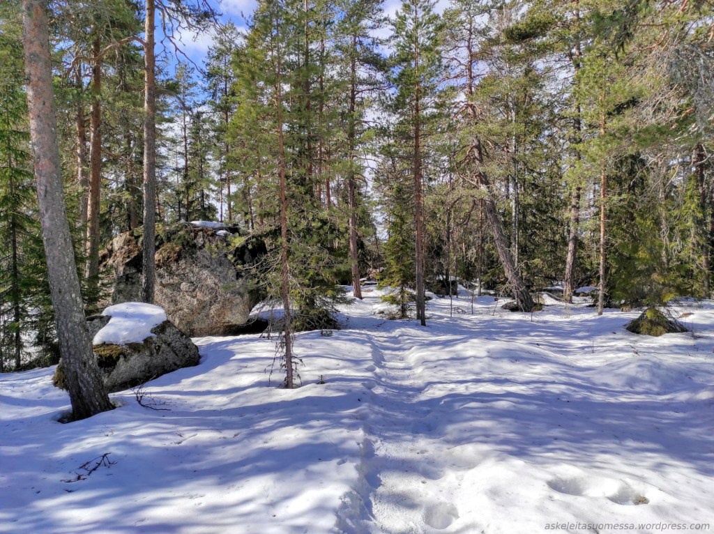 Majavapolulta Jätkän polku erkanee taas pienemmäksi metsäpoluksi ja pian maisemissa näkyy upeita kallioita.